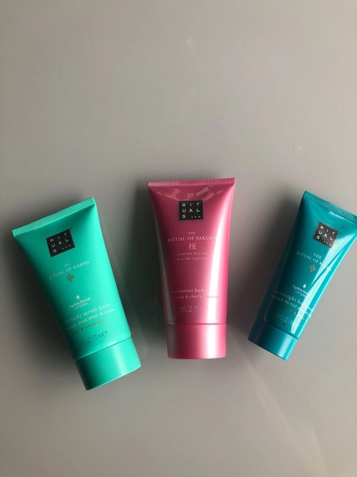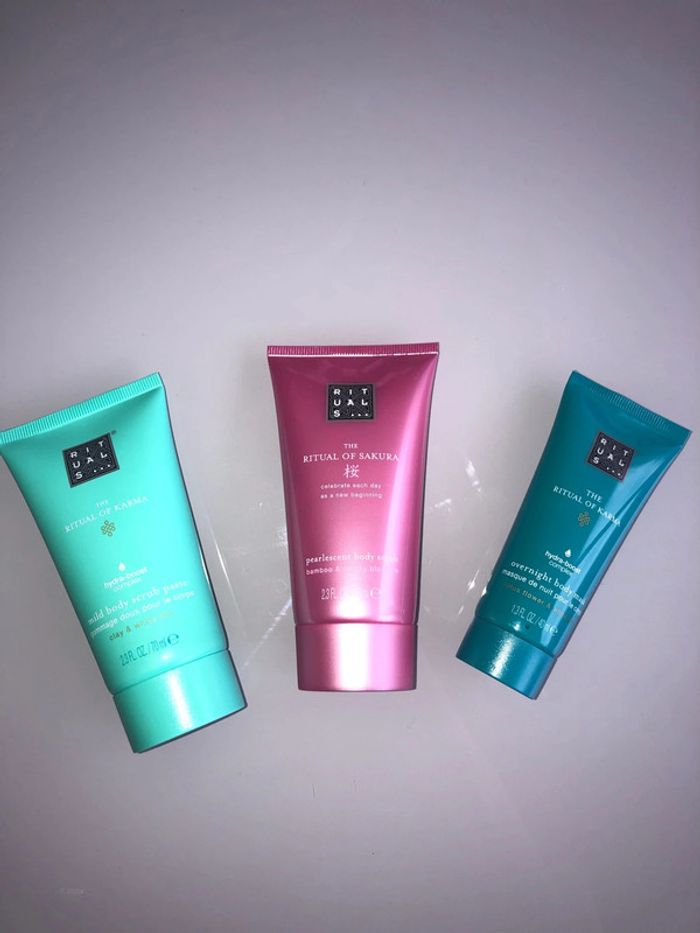 Lot de 3 articles rituals - ritual of sakura gommage pour le corps 70ml - rituals of karma gommage pour le corps 70ml - masque de nuit pour le corps 40ml Neuf avec étiquette Jamais utilisé #rituals #ritualscosmetics #gommage #gommagepourlecorps #ritualssakura #ritualskarma