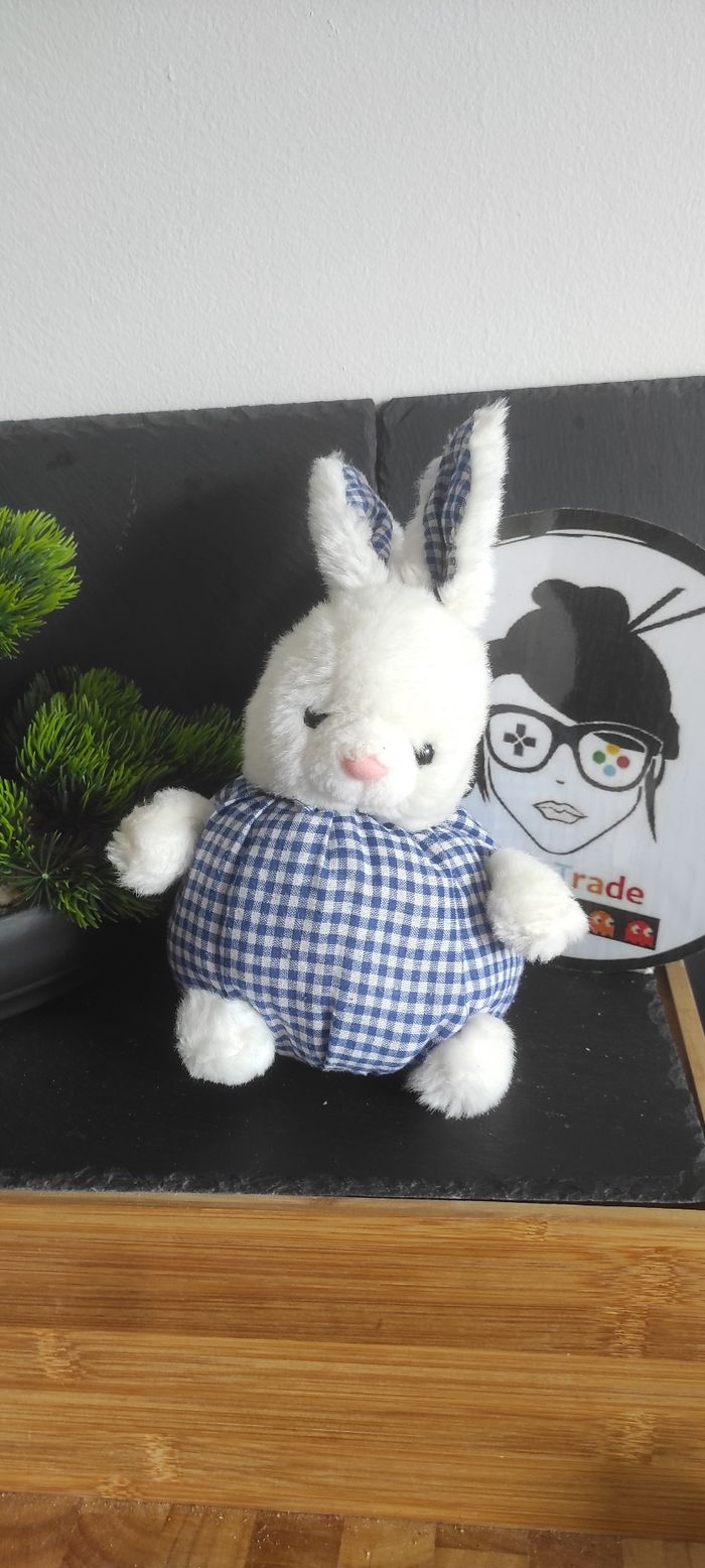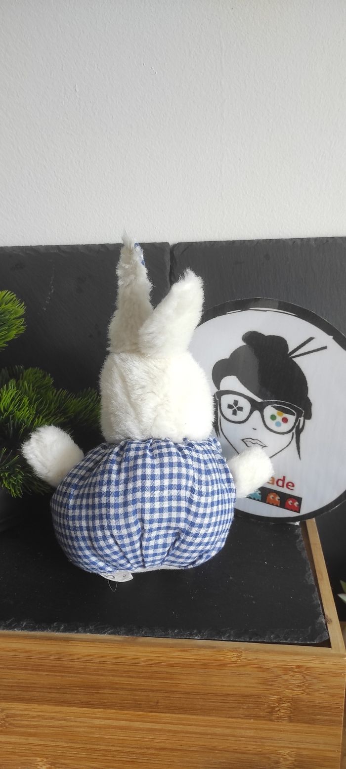 doudou peluche lapin pampers boule blanc bleu carreaux vichy rose ancien vintage