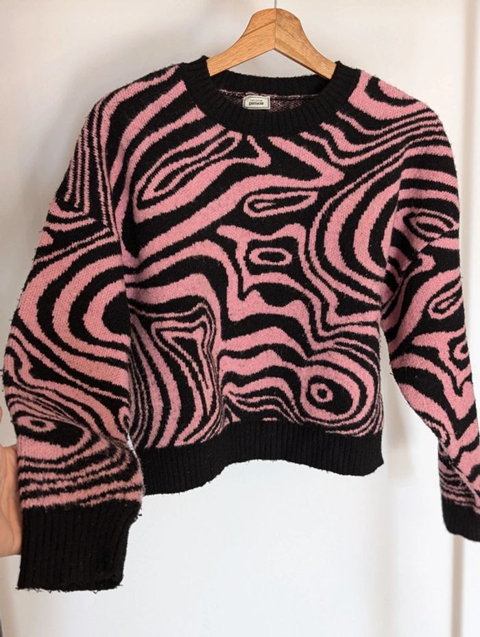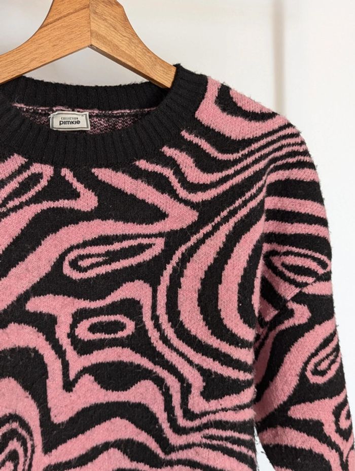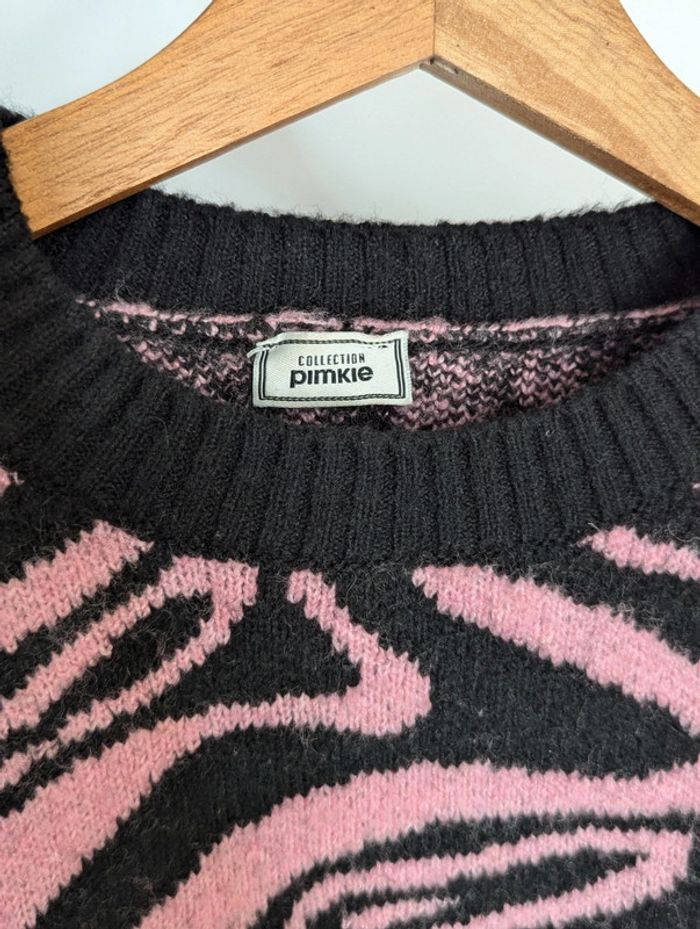 Gros pull col rond, noir et rose, PIMKIE, taille M, très bon état, acrylique majoritaire.
