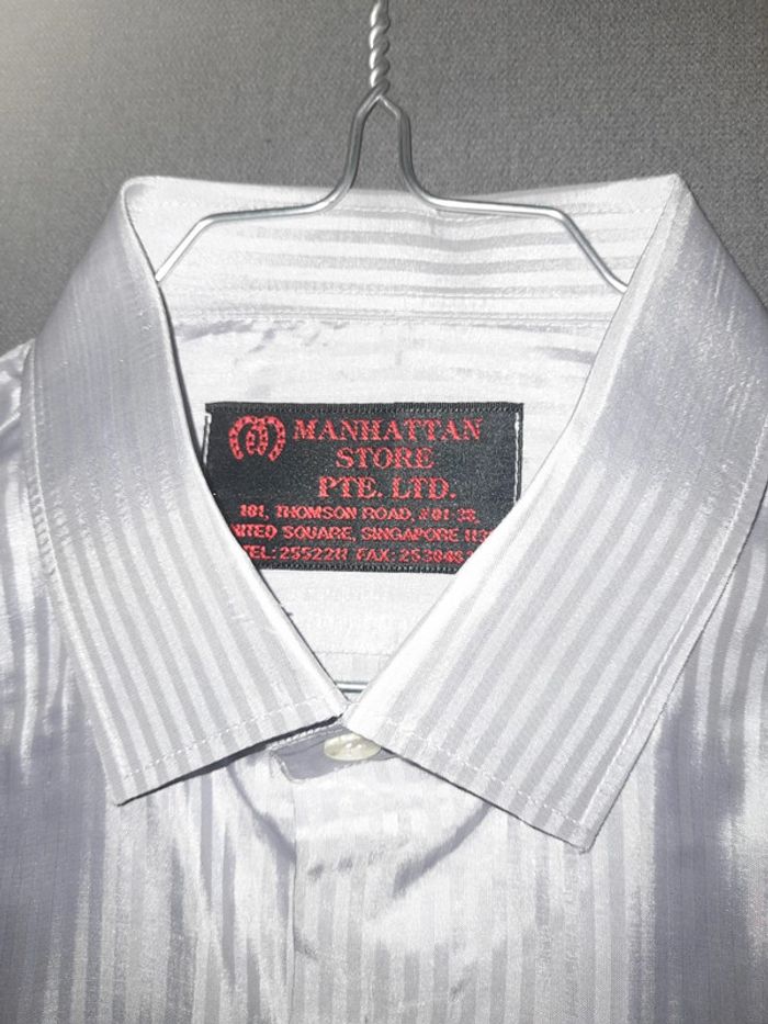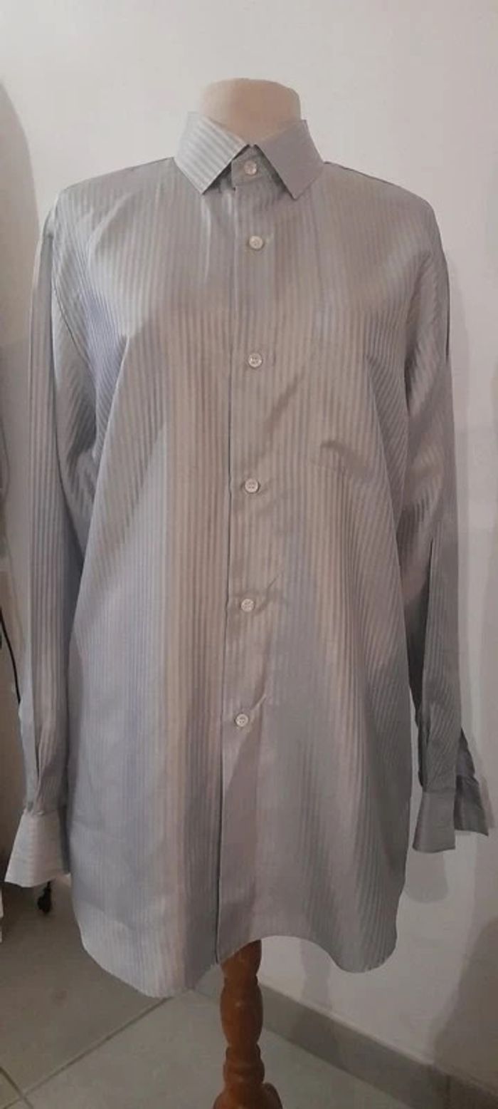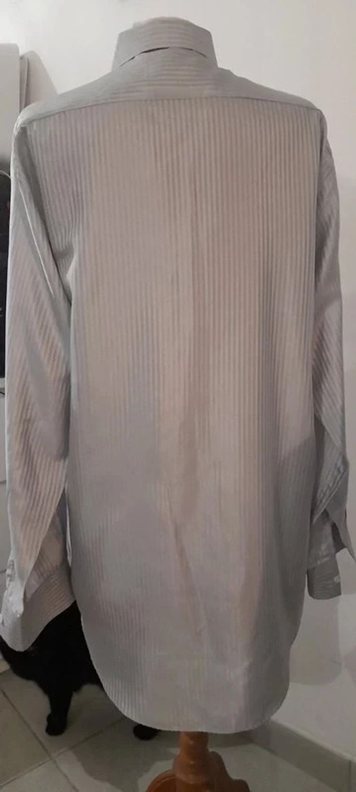 Chemise grus argent rayé en soie, faite sur mesure à Singapour taille m. Défaut un accro sur le devant voir photo