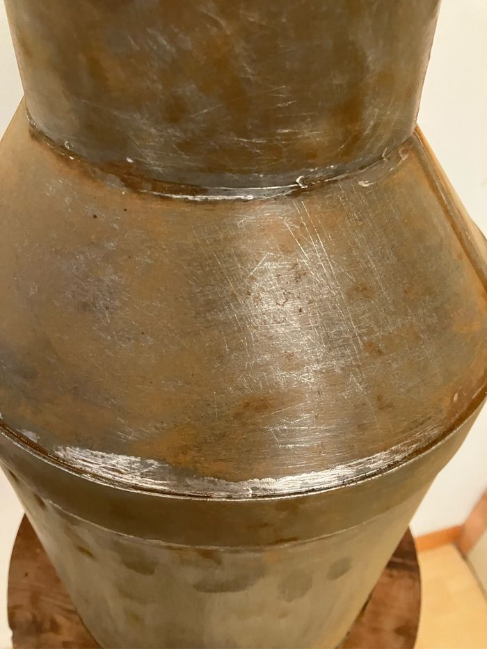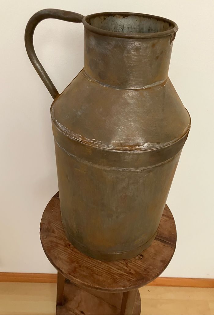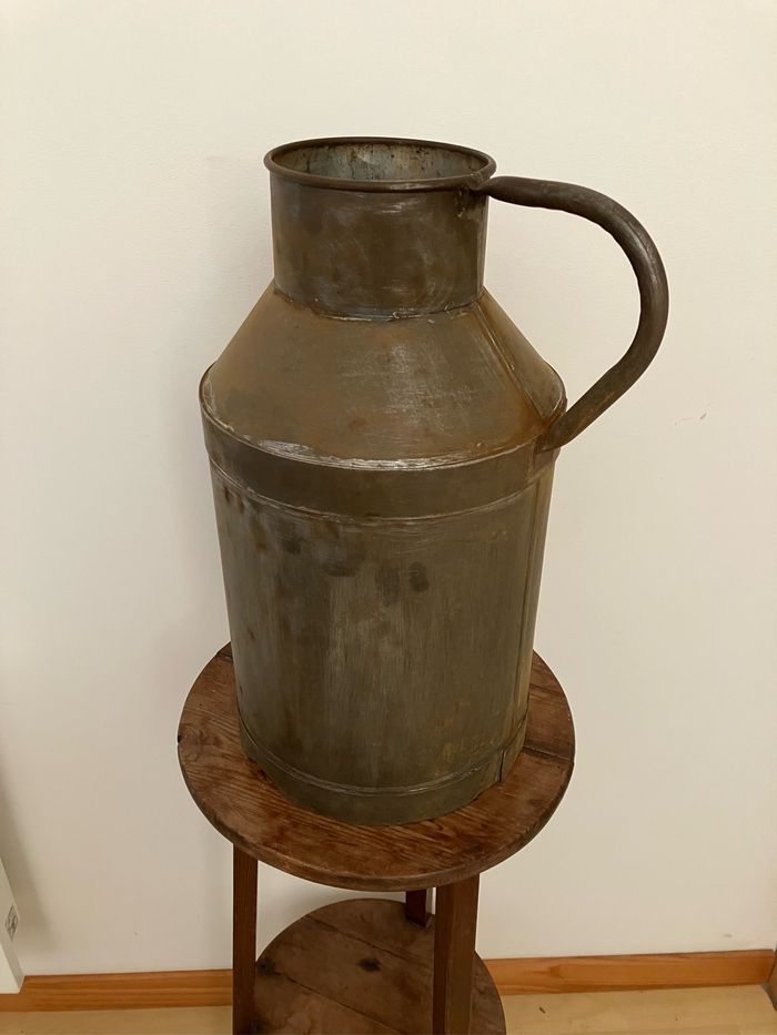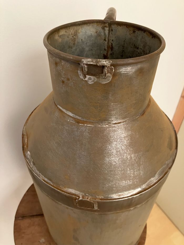 Ancien pot en métal pour transporter le lait. Mis en état satisfaisant/correct car il porte les traces du temps / un peu cabossé, une oreille est manquante, il est rouillé et il y a des micros trous au fond (voir photos) Toutefois, il peut être repeint, détourné pour la décoration pour une ambiance campagne. Dimensions : - hauteur : 40 cm - diamètre base : 21 cm - diamètre supérieur : 12 cm
