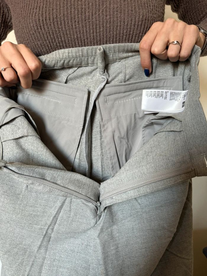 Pantalon gris large Repris par une couturière (voir photo intérieur) car je le trouvais bcp trop large Et au final ne me va toujours pas Taille M