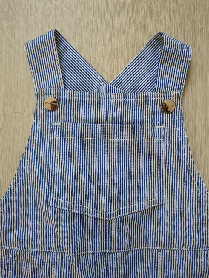 Neuf avec étiquette. Body blanc manches courtes avec col et ouverture par boutons à l'avant. Salopette à rayures blanches et bleues. Coton biologique.