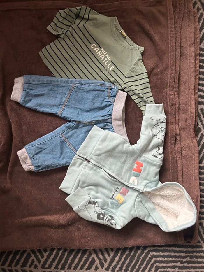 Lot comprenant : 1 Jean kimbaloo 1 t-shirt Tao 1 sweat fourré Disney baby