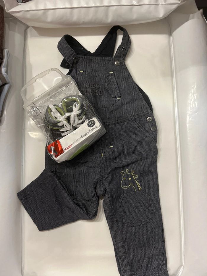 Adorable petite salopette neuve avec ses petites baskets assorties.