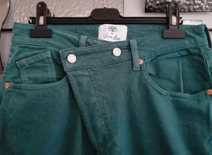 Très beau jean coupe croisée Mary Véronika Loubry Étiquette 24 Mesure de la taille à plat 36 cm c'est pour cette raison que je le mets en taille 36 longueur 93 cm env Couleur vert Neuf jamais porté