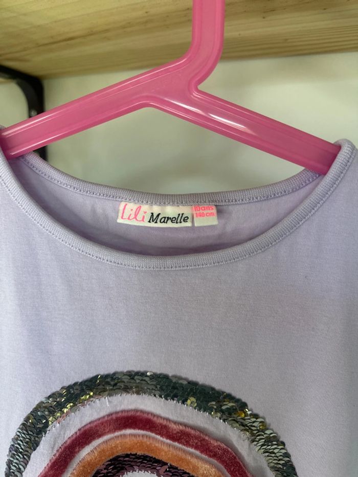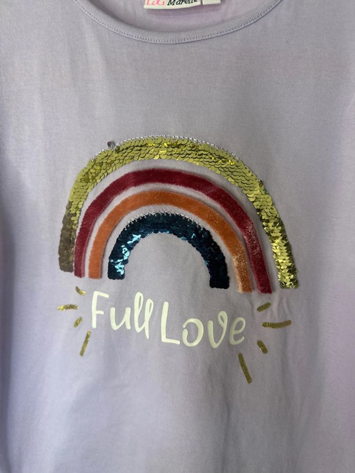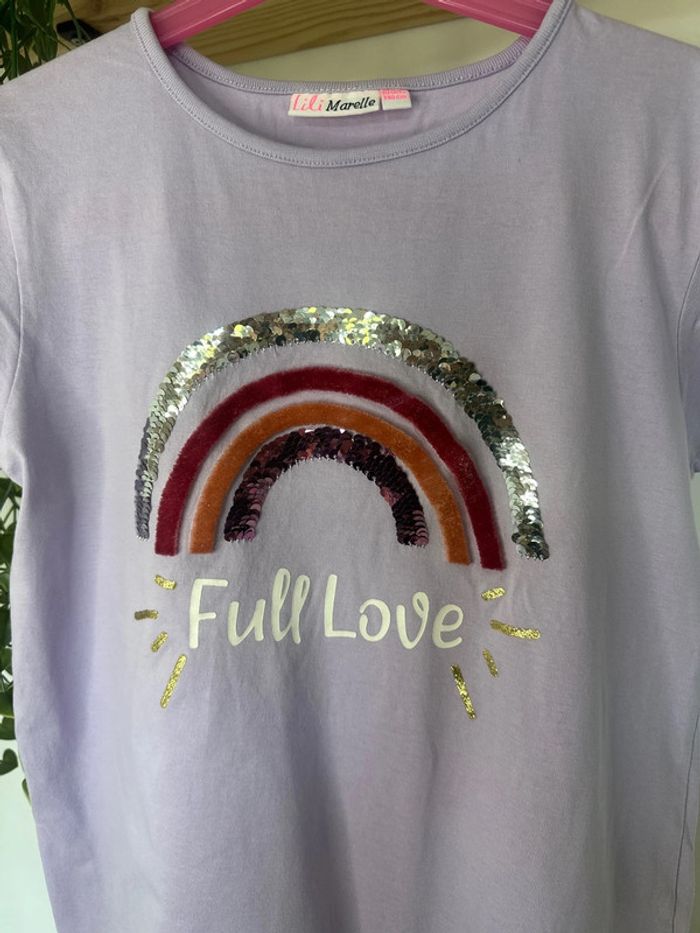 T-shirt manches courtes Lila parme avec motif arc en ciel en sequins réversible et velours Full love 10ans Très bon état Lili marelle #vivi_famous10ans