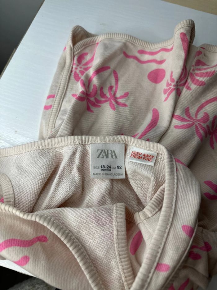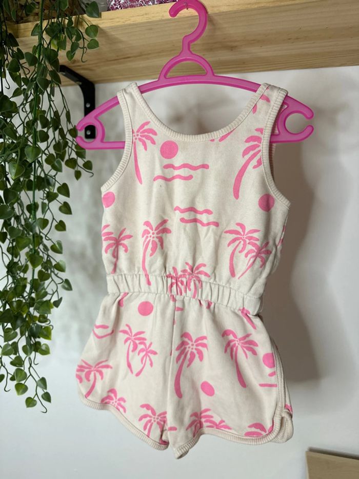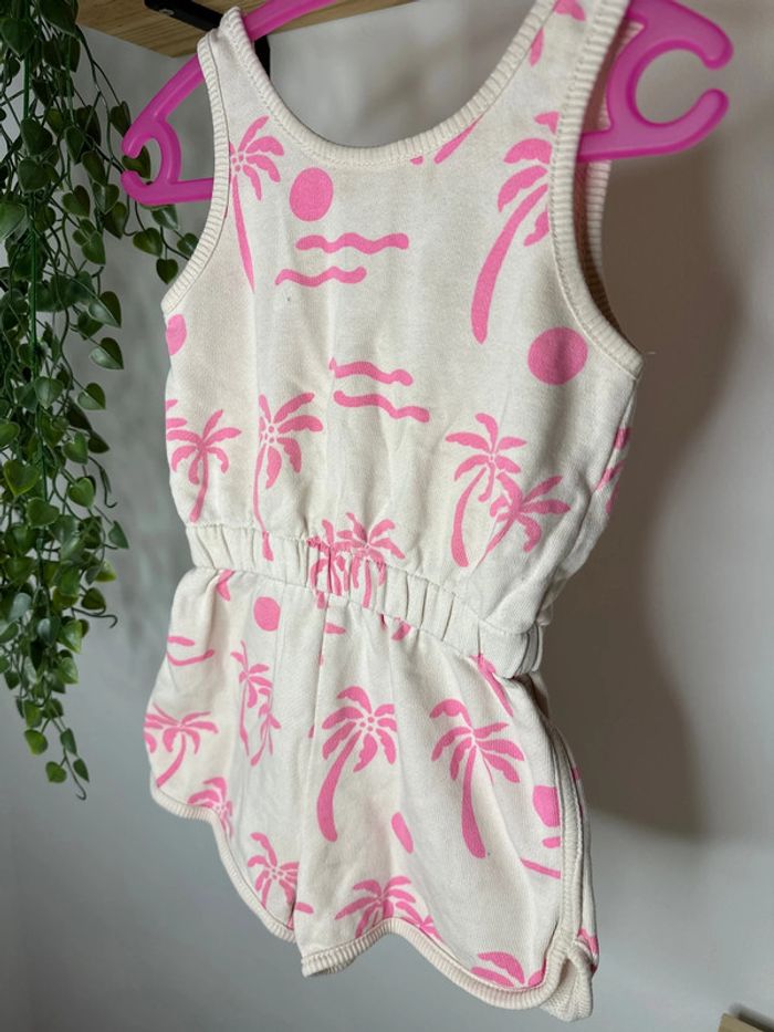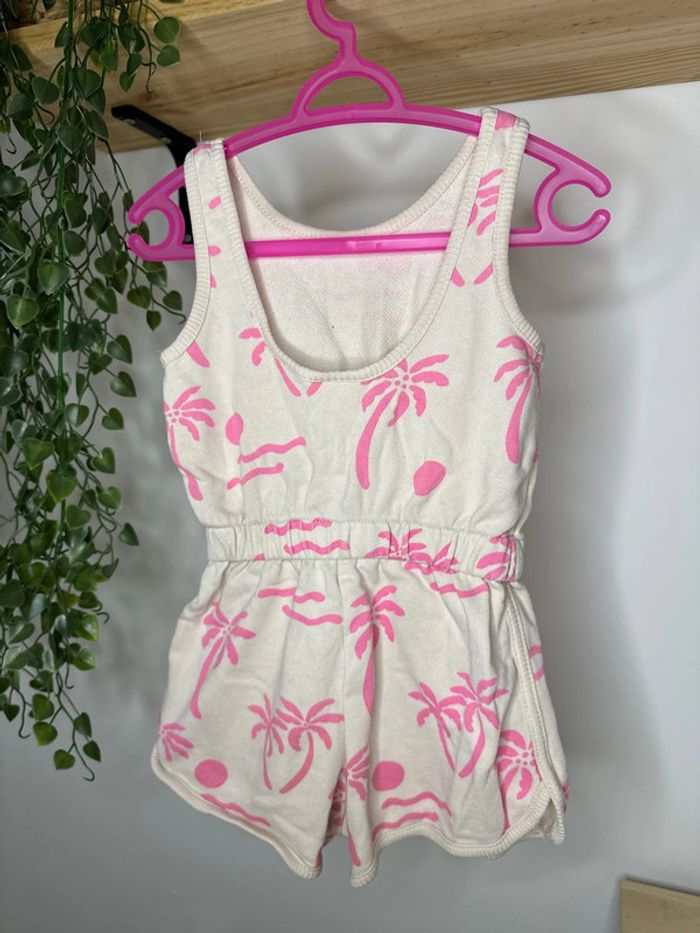 Barboteuse Combi combinaison short combi short Bretelles Beige crème et palmier rose Zara 92cm Très bon état (micro tache sur le devant voir photo) #vivi_famous23mois #vivi_famous24mois #vivi_famous2ans