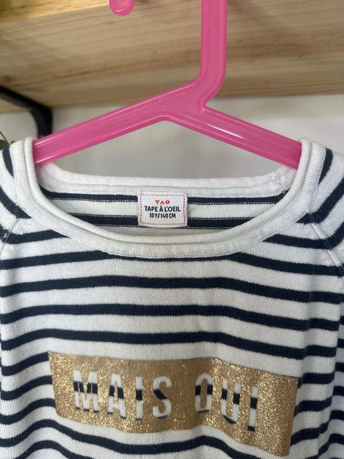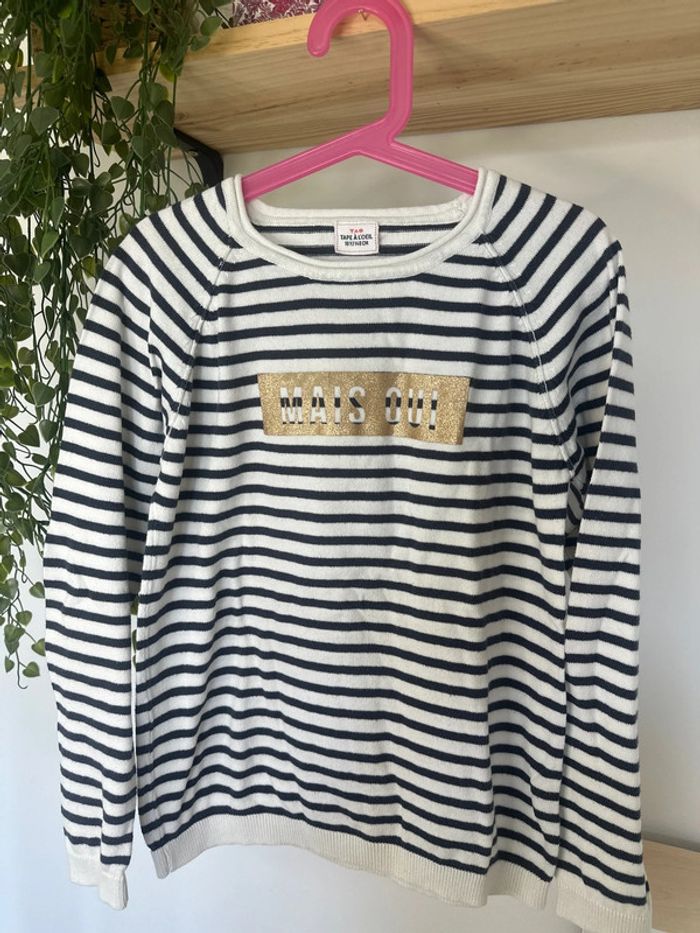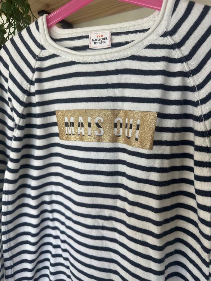 Pull fin Marinière blanc et bleu marine Inscription mais oui avec empiècement doré 10ans Bleu marine et blanc cassé Tape à l’œil TAO Très bon état #vivi_famous10ans