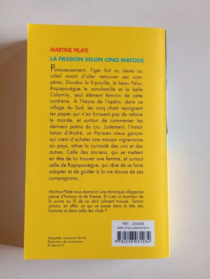 Paresseusement, Tiger fait sa sieste au soleil avant d'aller retrouver ses compères, Doudou la fripouille, le beau Félix, Rapapouègue le sans-famille et la belle Calamity, seul élément féminin de cette confrérie. À l'heure de l'apéro, dans ce village du Sud, les cinq chats rejoignent les papés qui n'en finissent pas de refaire le monde, et surtout de commenter les derniers potins du cru. Justement, l'installation d'André, un Parisien vieux garçon qui vient d'acheter une maison vigneronne, attise la curiosité des uns et des autres. Celle des anciens, qui se mettent en tête de lui trouver une femme, et surtout celle de Rapapouègue, qui rêve de se faire adopter et de goûter à la vie douce de ses compagnons... Sait-on jamais ce qui se passe dans la tête des hommes et dans celle des chats?? Editeur : Piment 282 pages Dimensions : 11 x 18 cm Livre état neuf #chat