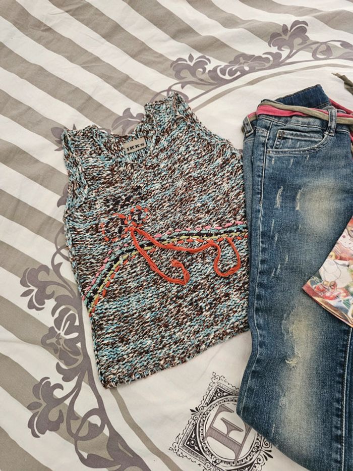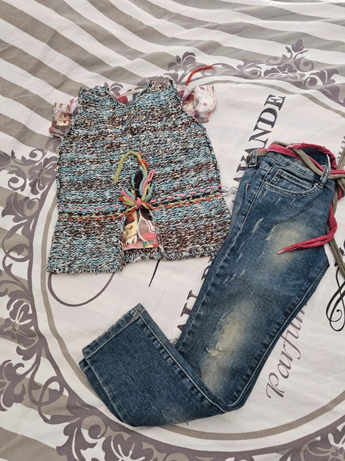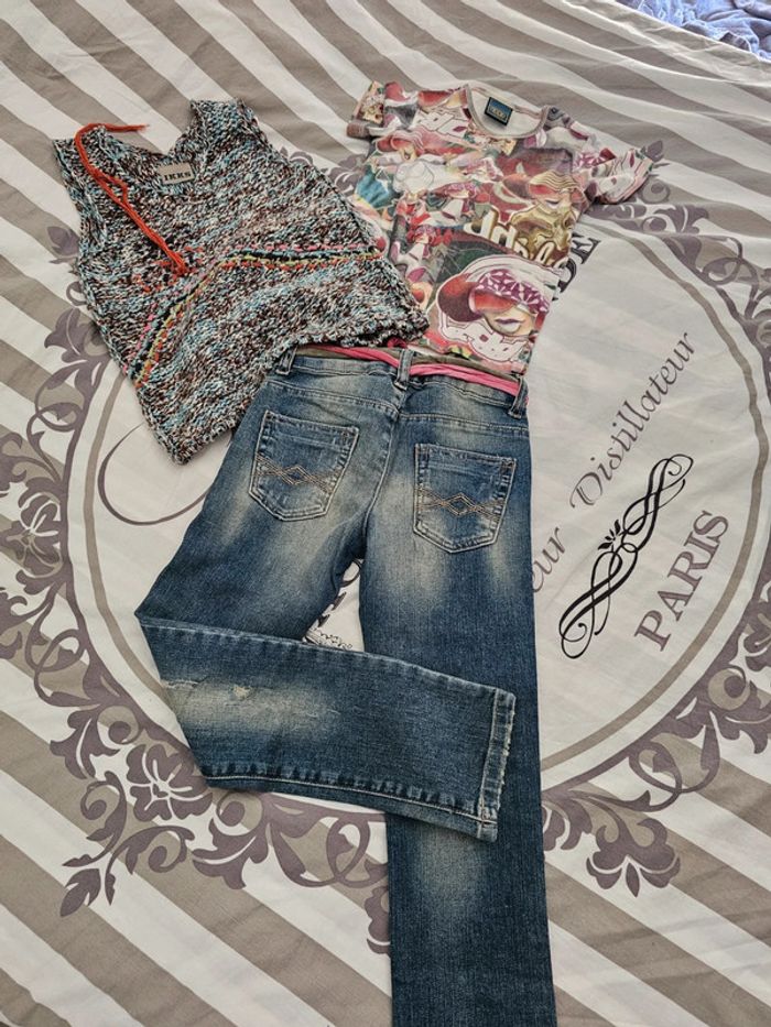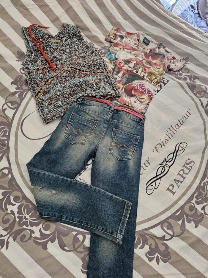 Je vends un jean neuf de chez zara tail’e réglable Un pull sans manches ikks Un tee shirt ddp Le prix du lot c est le prix payé pour le jean Tout les articles sont en très bon état voir neuf