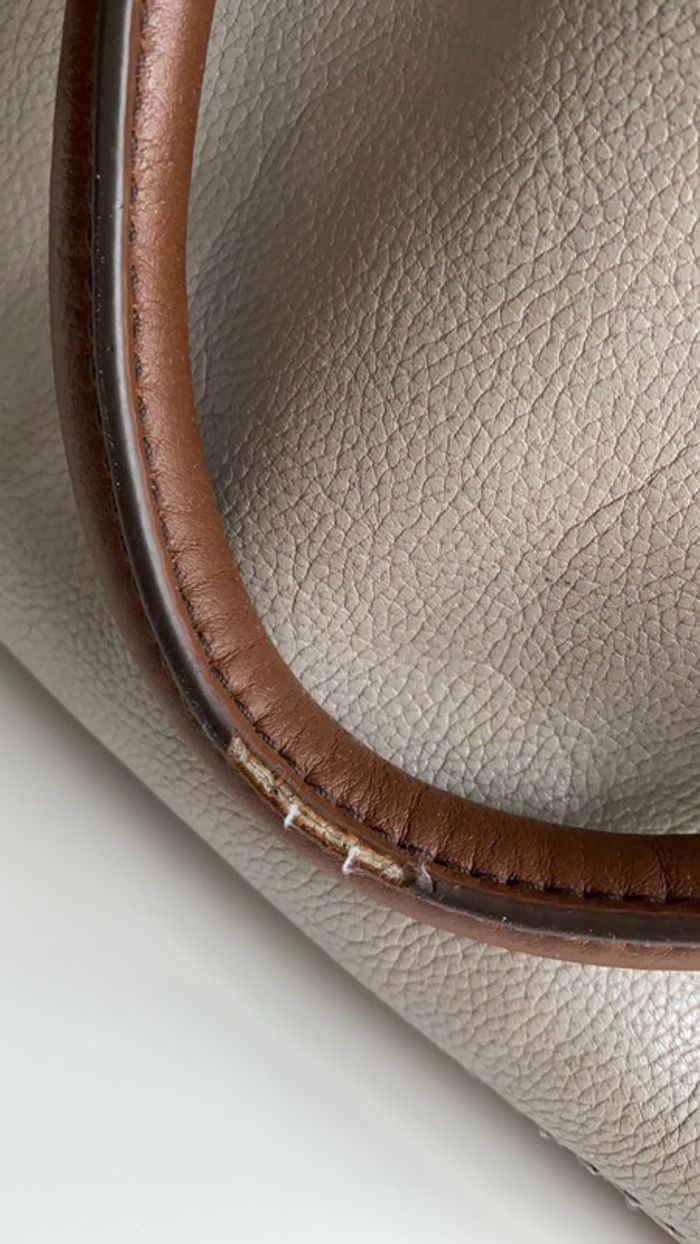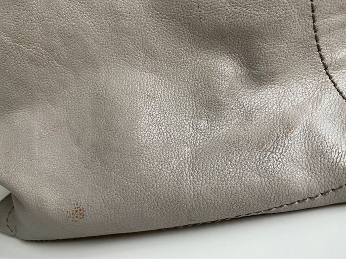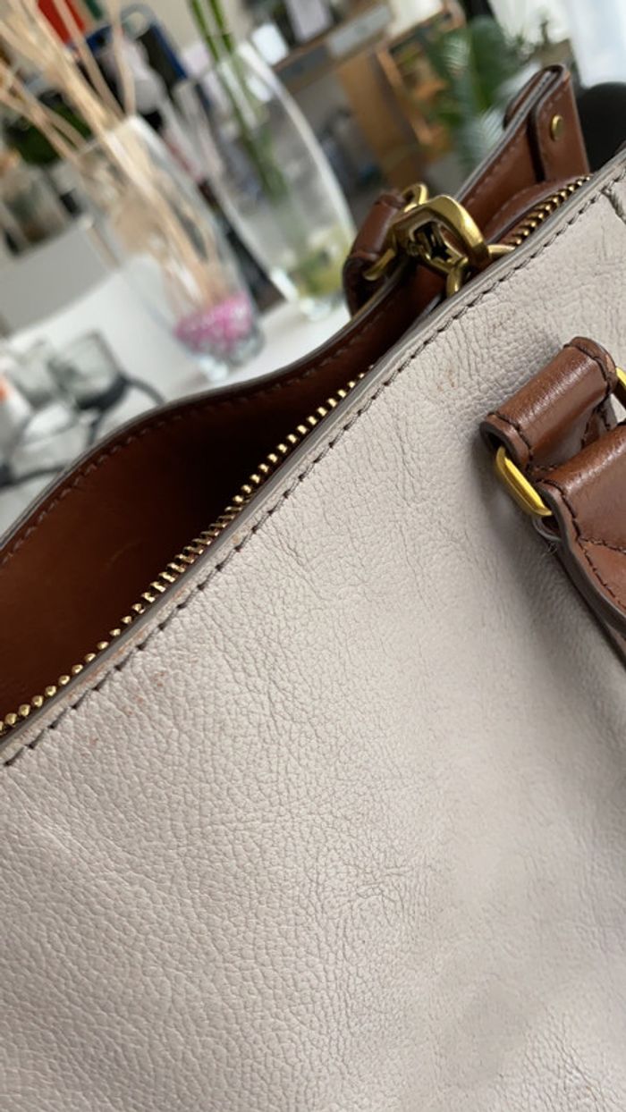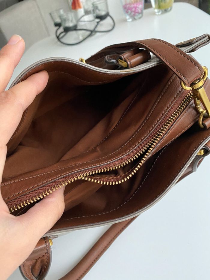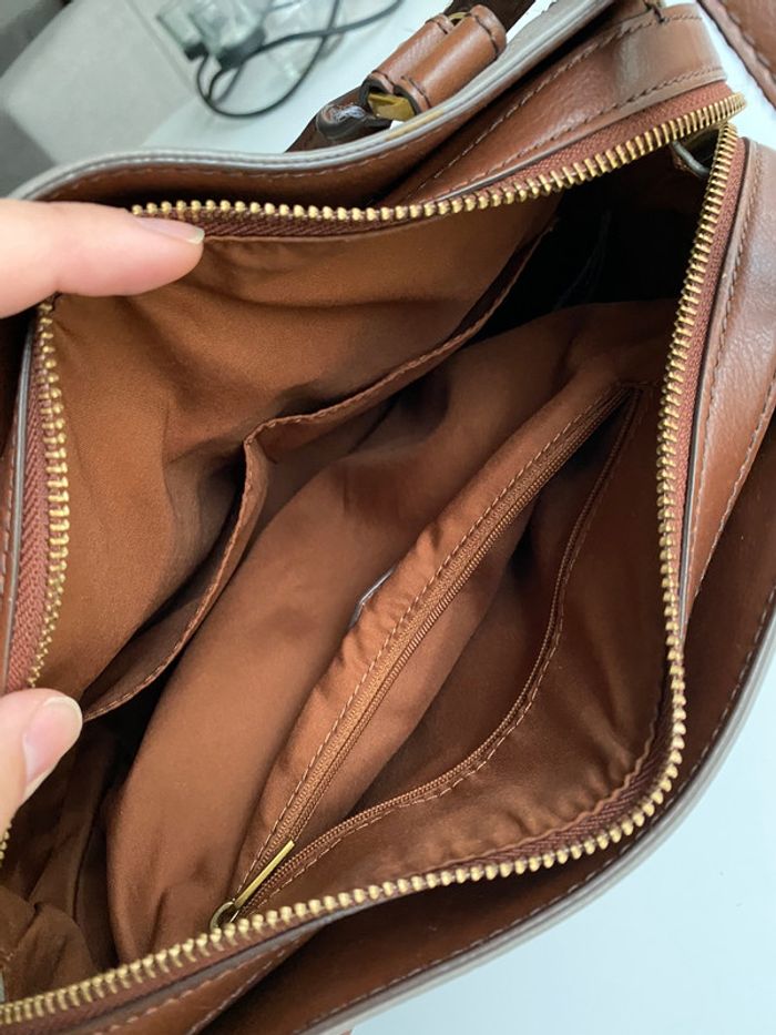 Bon état, deux poches latérales non fermée et trois poches internes dont une fermable. Lanière pour le porter en bandoulière. quelques taches dues au frottement ( voir photos) et une anse légèrement abîmée ( voir photo )