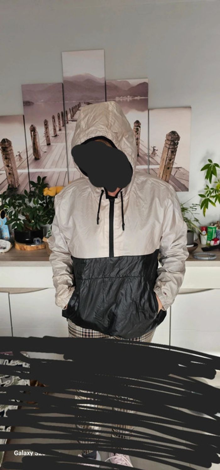En très bon état porté 3 ou 4 fois coupe vent doublé polaire noir avec poches zippées cordon de resserage à la capuche très belle qualité
