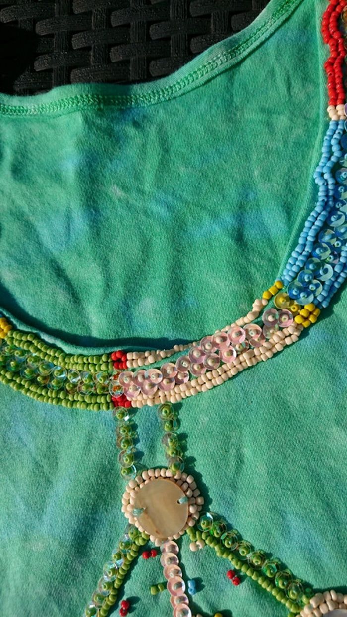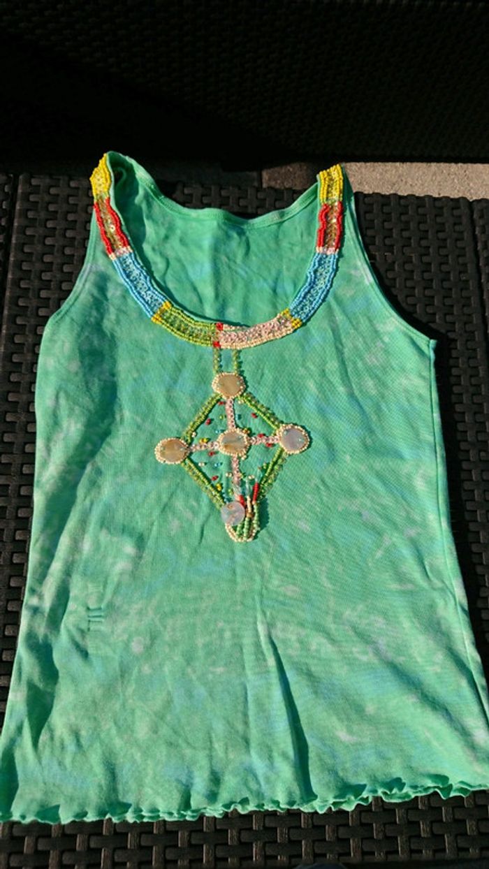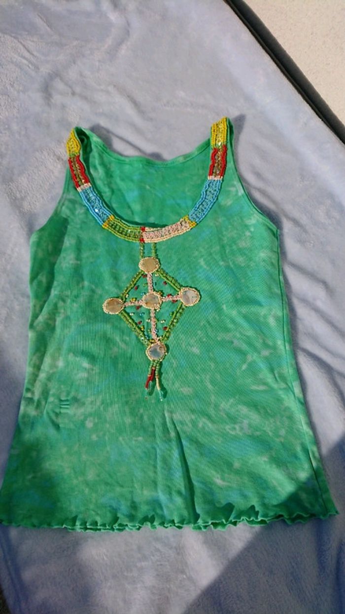 Porte une fois top fantaisie vert dans de joli tons en coton avec de jolies finitions perlées N hésitez pas à consulter mes autres ventes enfants de marque à petits prix