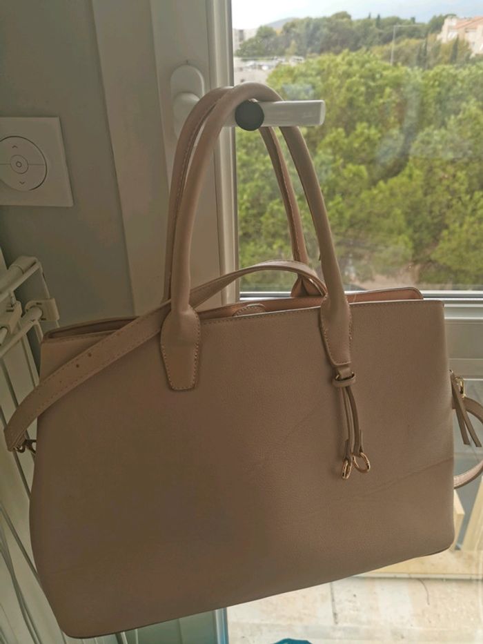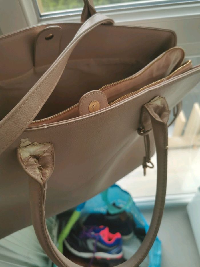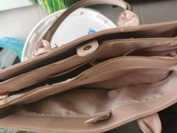 Sac rose fantaisie en très bon état sauf à l intérieur des hanses 3 pochettes dont une zippées on peut y mettre des cahiers à saisir