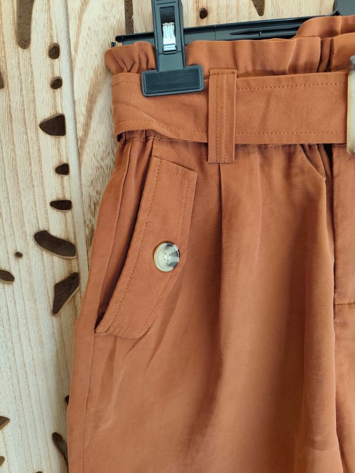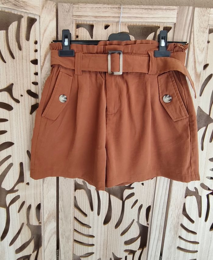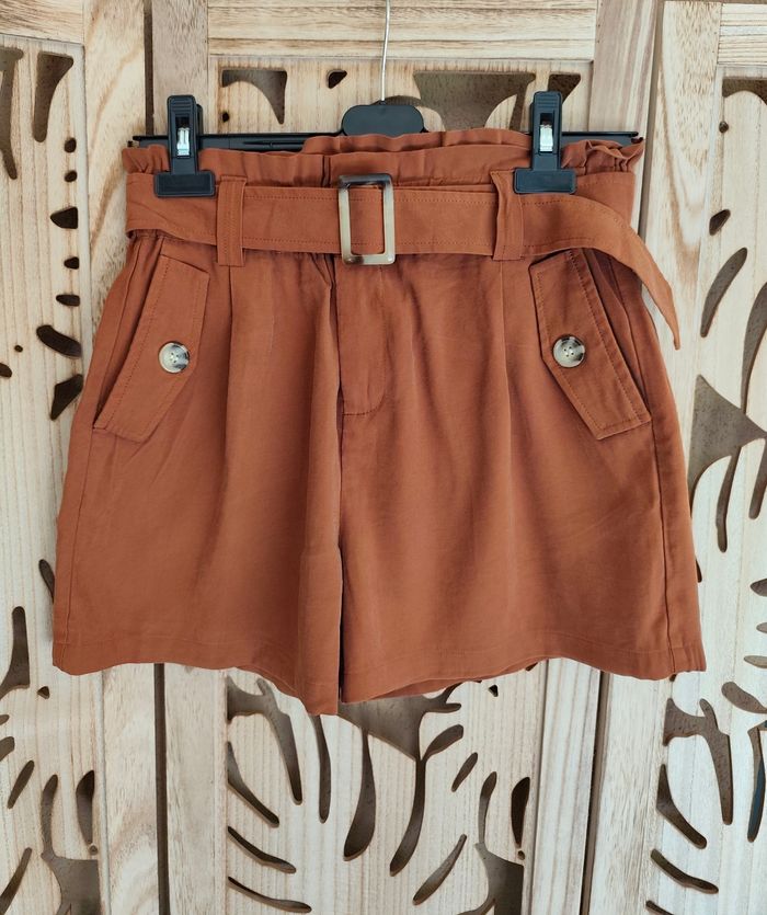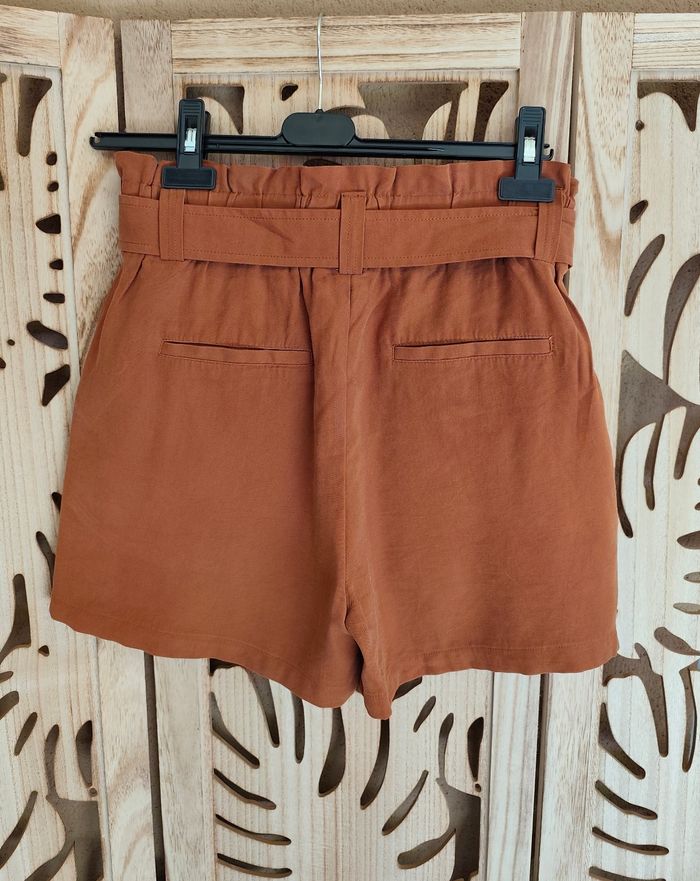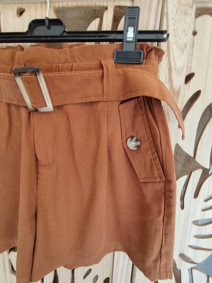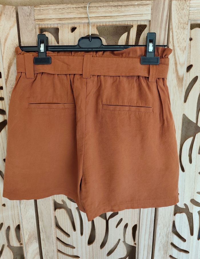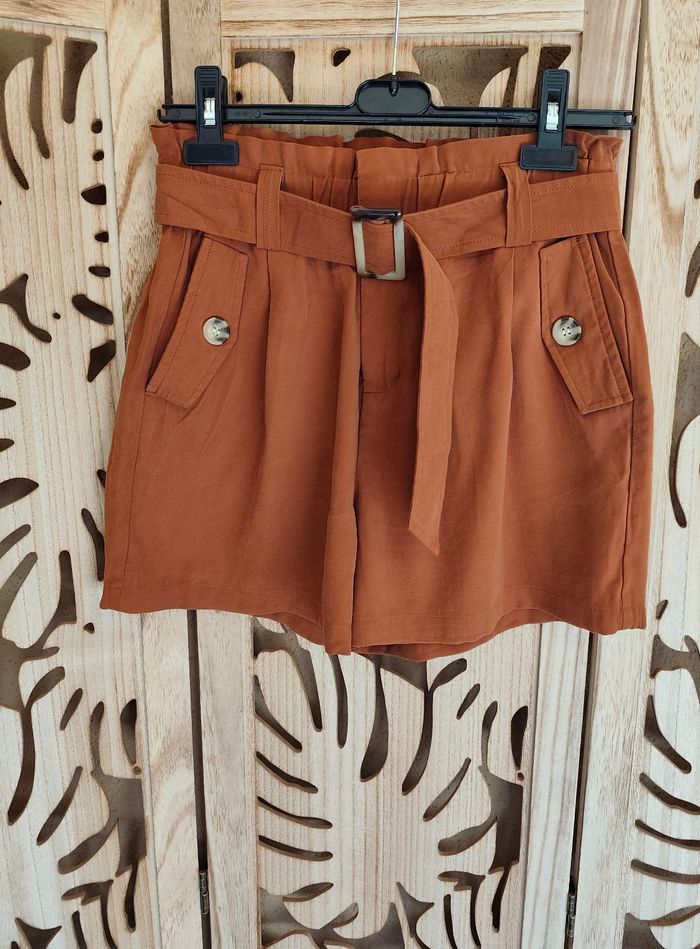Short paper bag fermeture éclair, bouton et agrafe avec ceinture un bouton décoratif sur les 2 poches Taille 34 Matière : 92 % viscose, 8 % polyester Entrejambe : 9 cm