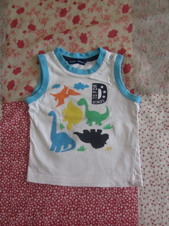 Débardeur blanc bordure bleu clair, motif dinosaures Boutonné sur une épaule Short bleu clair bordure bleu marine assorti Coton Excellent état Original Marines, 9 mois Nombreuses annonces disponibles Dressing trié par catégories et tailles #Baby_Boy_9_mois