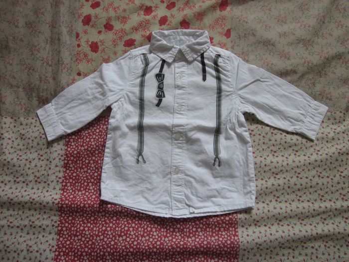 Chemise manches longues Blanche, motif bretelles et noeud papillon Boutonné devant Coton Très bon état Kimbaloo, 6 mois Nombreuses annonces disponibles Dressing trié par catégories et tailles #Baby_Boy_6_mois