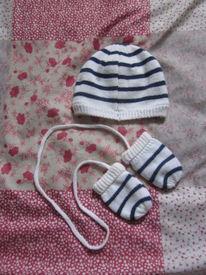 Bonnet écru rayé bleu et moufles 6-12 mois - photo numéro 1