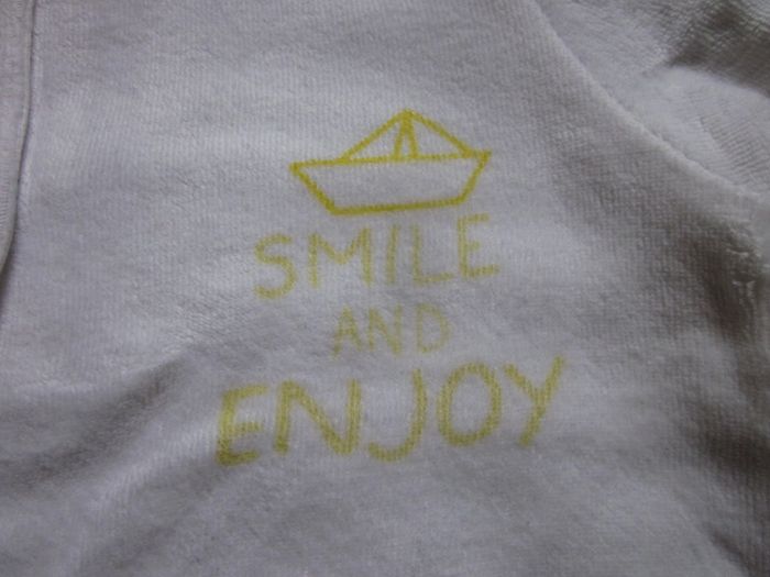 Pyjama velours ouverture devant Blanc, motif "Smile and enjoy" jaune Boutonné à l'entrejambe Coton, polyester Très bon état Vertbaudet, 6 mois / 67 cm Nombreuses annonces disponibles Dressing trié par catégories et tailles #Baby_Boy_6_mois