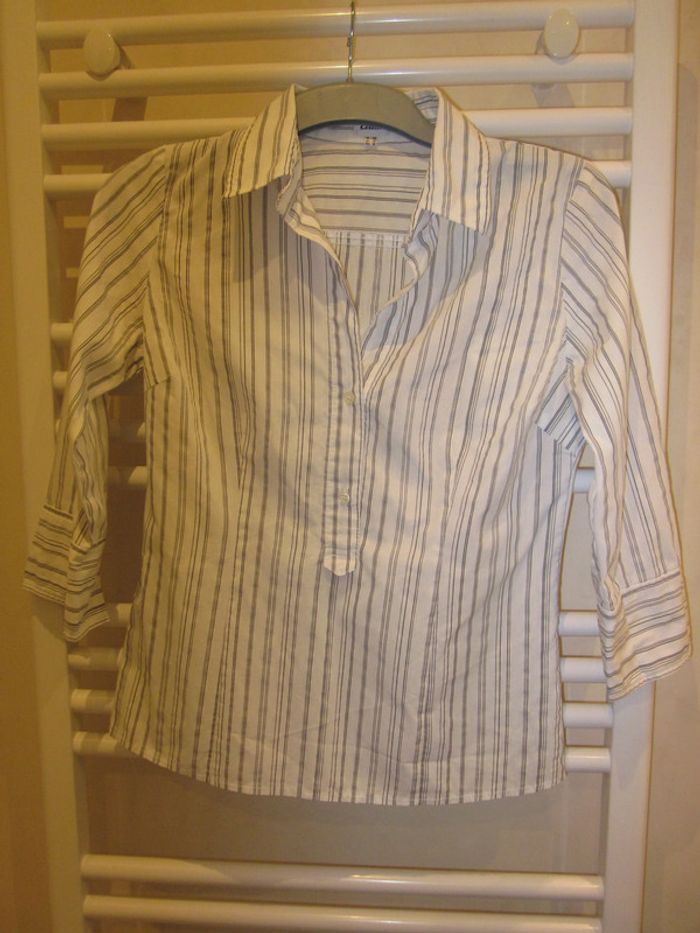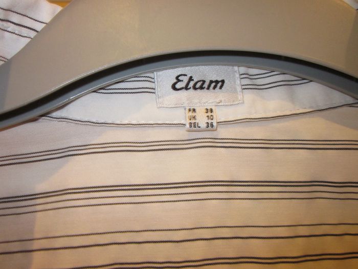 Chemise blanche avec fines rayures noires (rayures tissées) Cintrée Manche 3/4 Boutonnées à moitié Très bon état, peu portée 97% coton + 3% polyester Etam, taille 38 #Women_vêtements