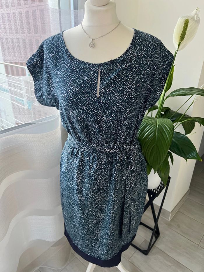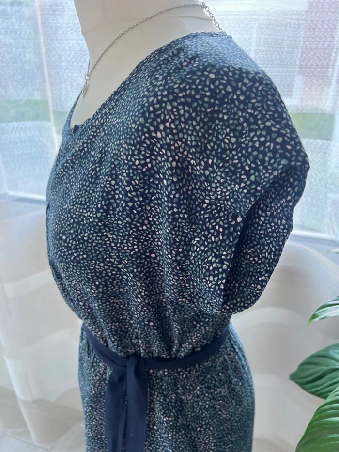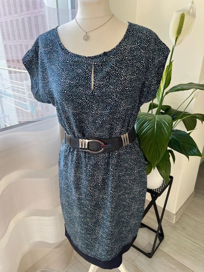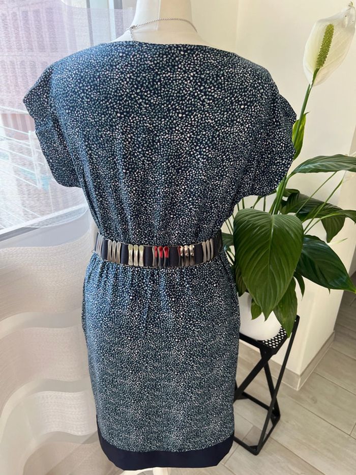 Très jolie robe marque Sud express. Légère pour l’été. Longueur sous genou env 94cm Ceinture réversible Vous pouvez aussi vous en servir de bandeau pour les cheveux (j’offre une autre ceinture,voir la dernière photo)