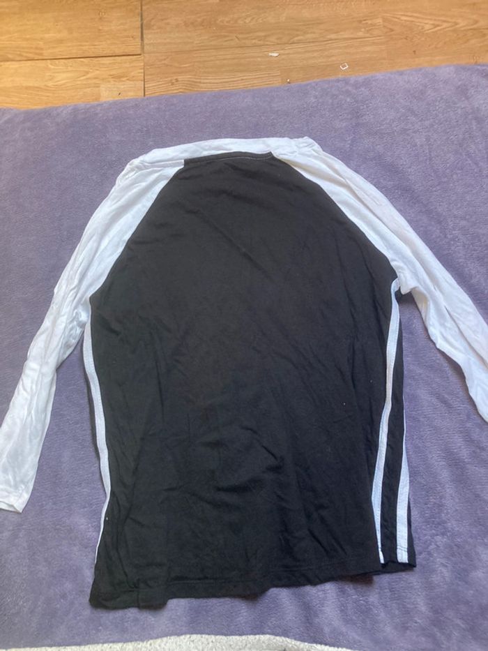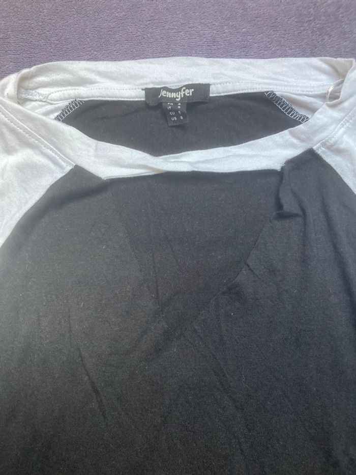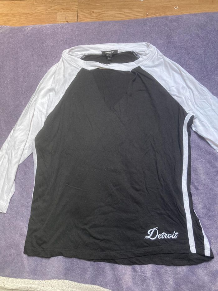 TEE shirt manches longues Jennifer taille S avec écrit détroit en bas. TEE shirt en V avec une bande blanche au cou. Très peu porté
