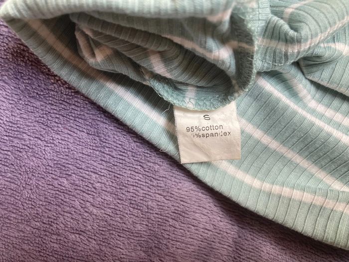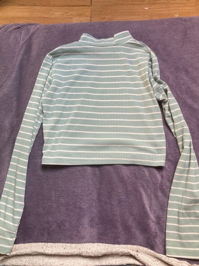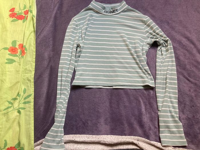 Haut court à manches longues taille S vert et blanc très peu porté.
