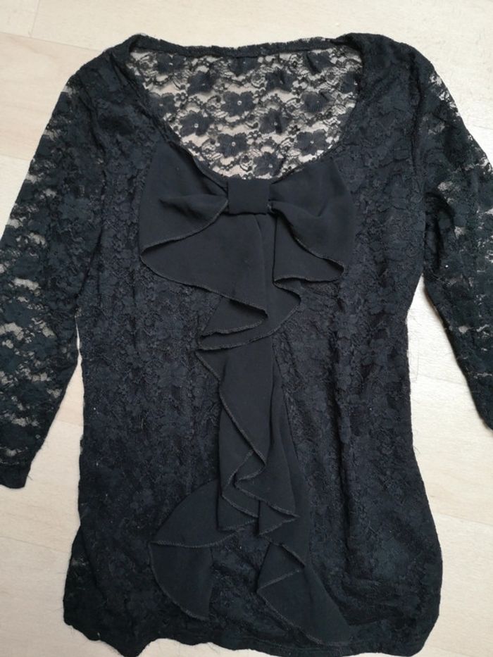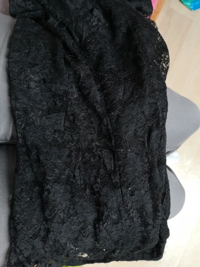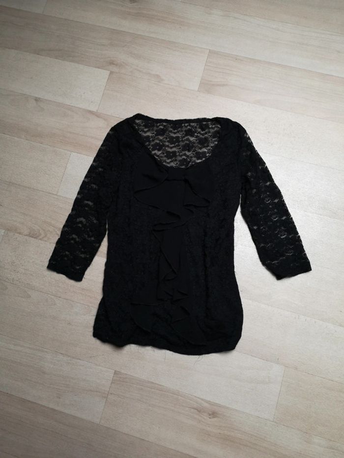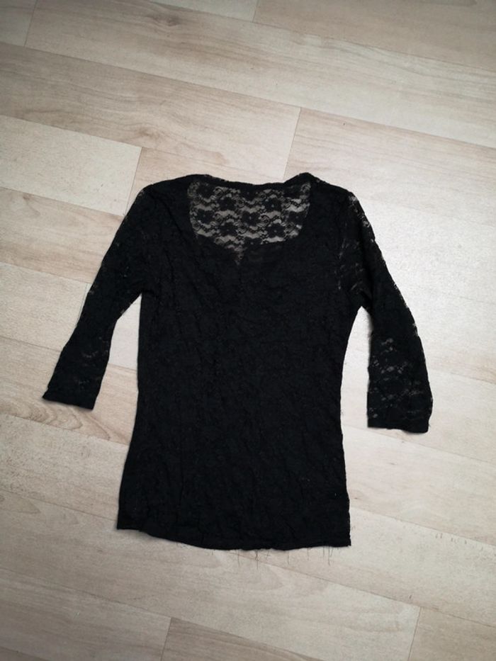 Tee shirt noir en dentelle, manche 3/4. Très peu porté mais petits fils qui dépasse voir dernière photo.