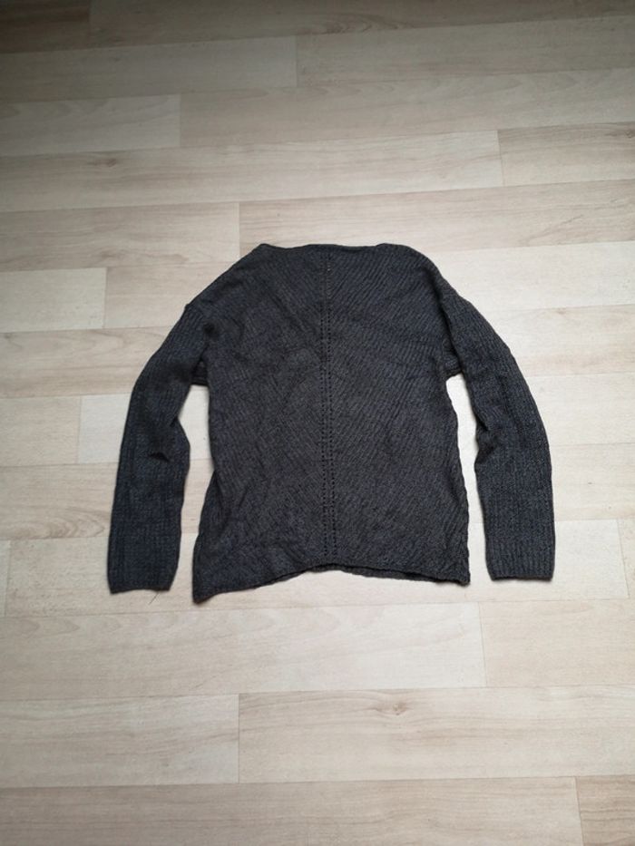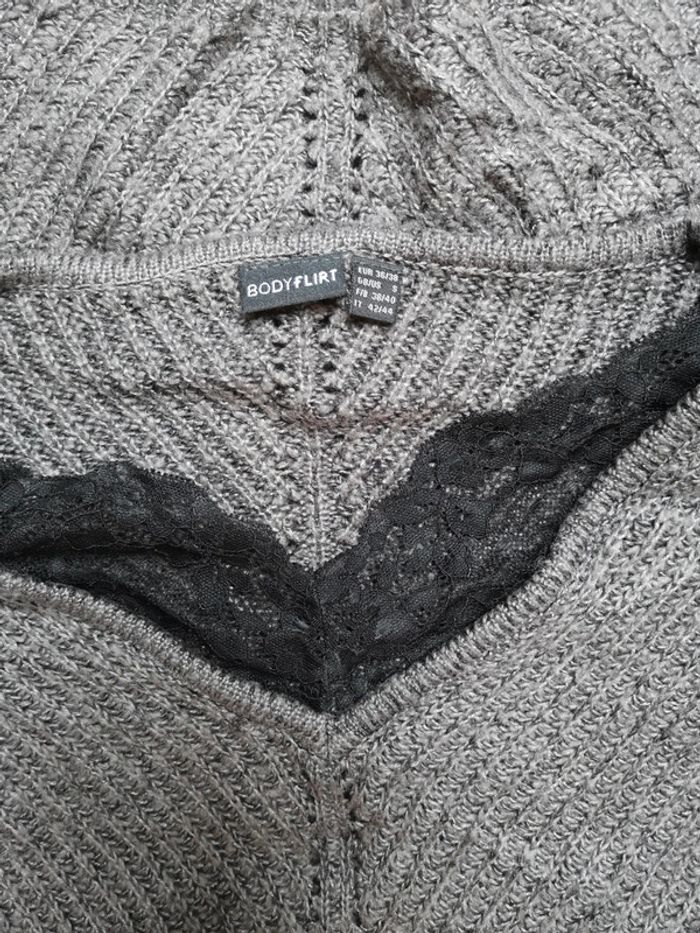 Pull femme gris foncé et dentelle noir au niveau du col, très peu porté. Taille 38/40
