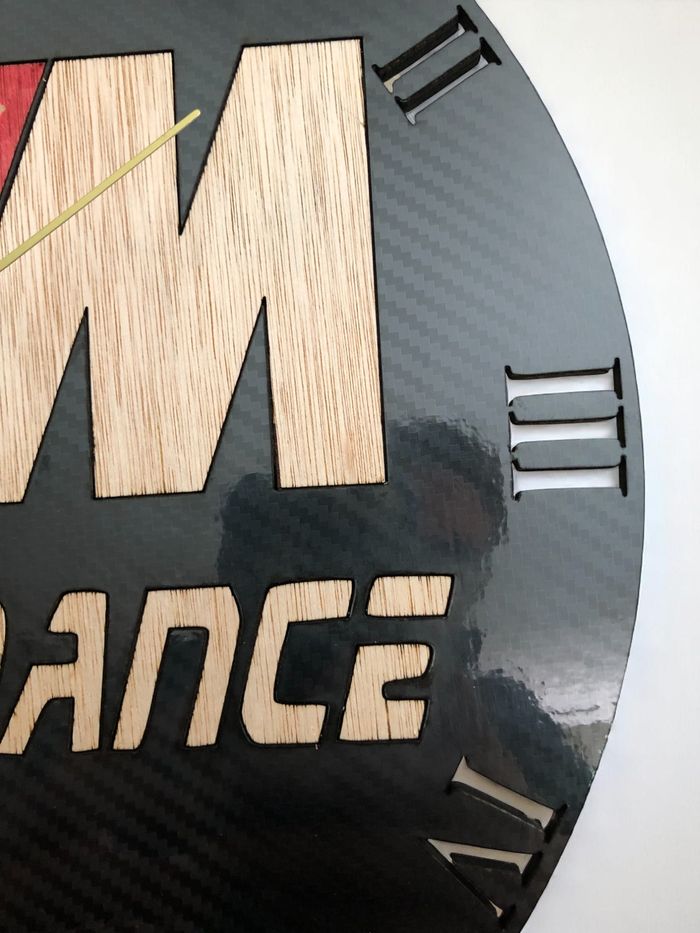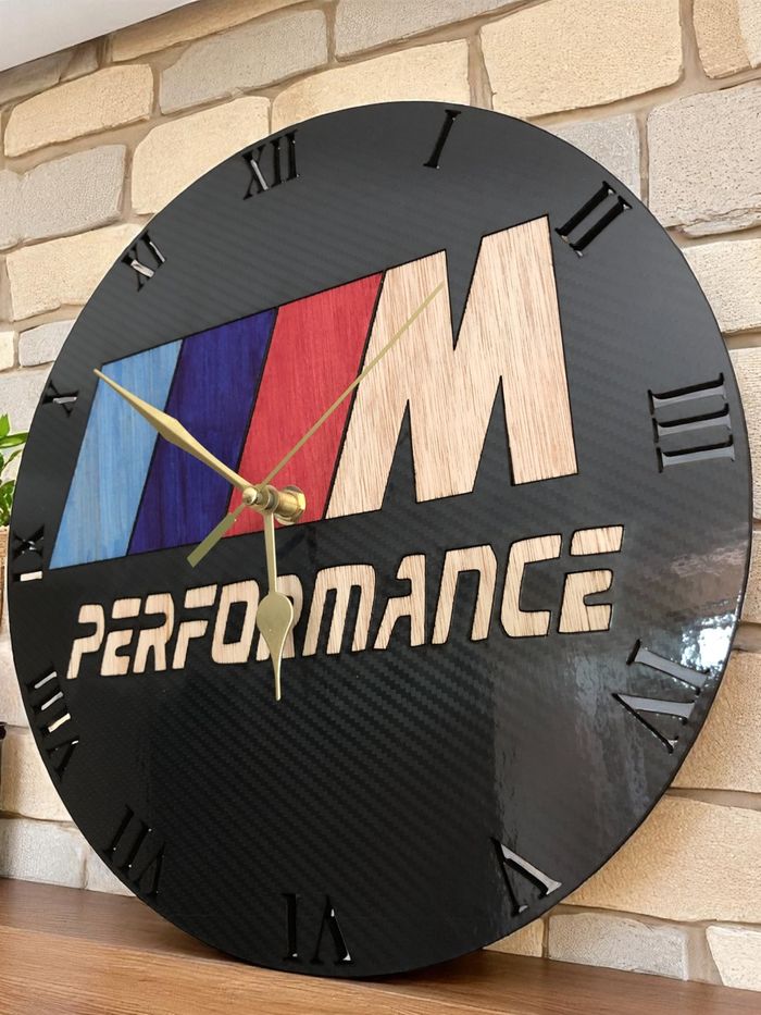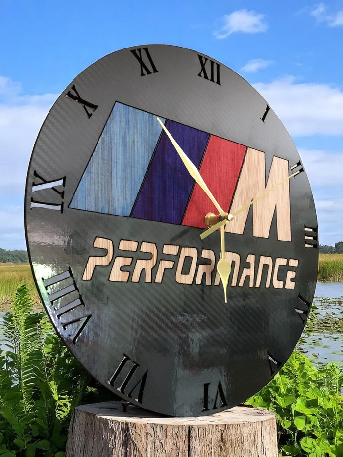 Horloge en bois bmw Pack M performance neuve avec mécanisme silencieux, diamètre 29 cm, finition adhésif carbon.