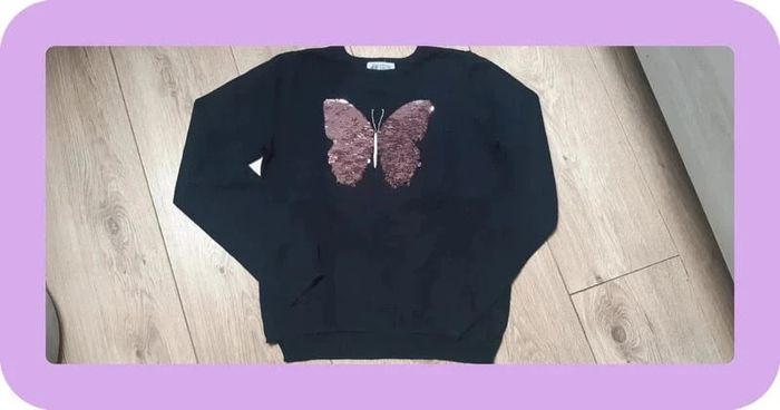 Pull fin h&m 134/140 cm noir papillons séquins réversibles état neuf - photo numéro 1