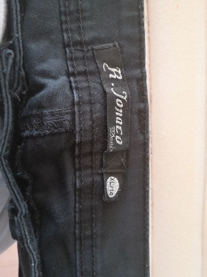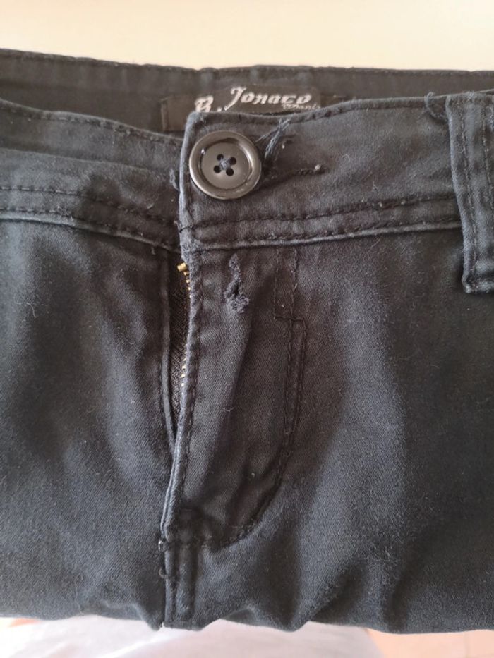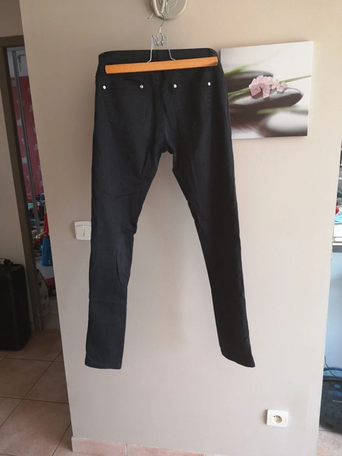 Jeans noir portés à plusieurs reprises. Petit accro au niveau du bouton et de la fermeture mais n'empêche en rien de le porter. Noté taille xl mais correspond plus à un 38/40
