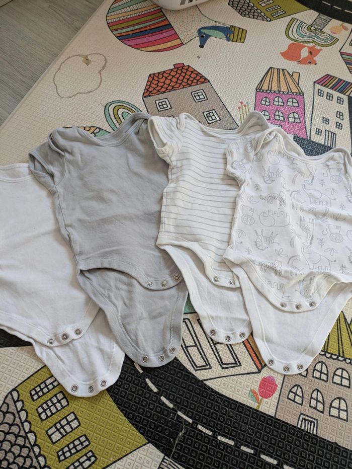 Lot de 4 bodies Primark 9-12 mois Très bon état sauf 1 avec petites taches #lucasandcie9mois #lucasandcie12mois Mixte gris et blanc zébre éléphant savane rayure