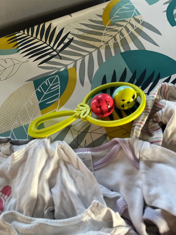 Lot bodies 3/6 mois ont des défauts taches bavoirs et tee shirt et un hochet ont tous des taches mais peuvent encore dépanner je l’offre pour tout achat dans mon dressing diverses marques
