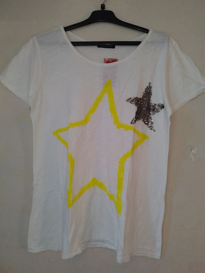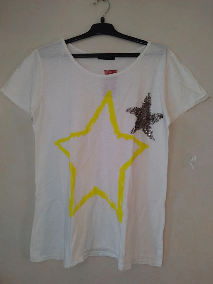 En très bon état tshirt blanc avec ses 2 étoiles dont l'une est paillettée. #lvlk_femmeT38 #tshirtfemme38 #tshirtblancfemme38 #tshirtfemmeuni38