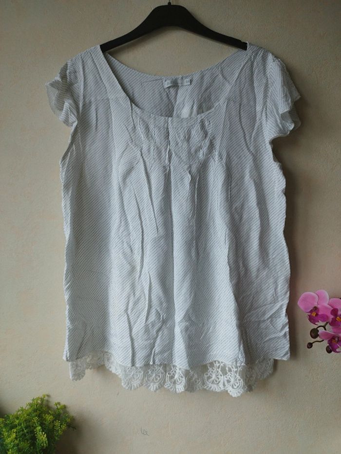 En très bon état. Blanche avec de petits points noirs, elle est bordée de dentelles blanches. Elle ira magnifiquement avec n'importe quel bas.
