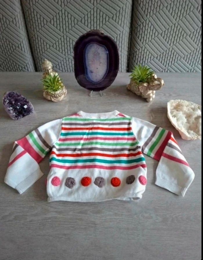 Magnifique gilet Blanc avec rayures colorées Et pompons brodés Excellent état Marque orchestra Taille 9 mois ✉️ 📩 Envois rapide et soigné ✉️ 📩 Maison non-fumeur 🏠