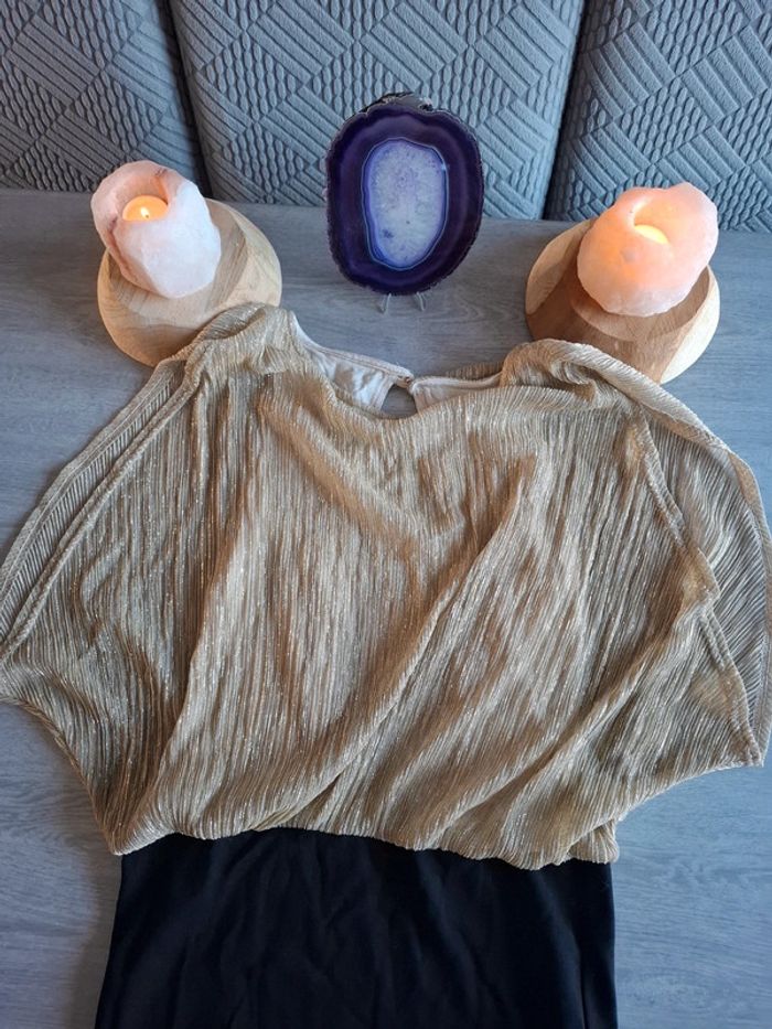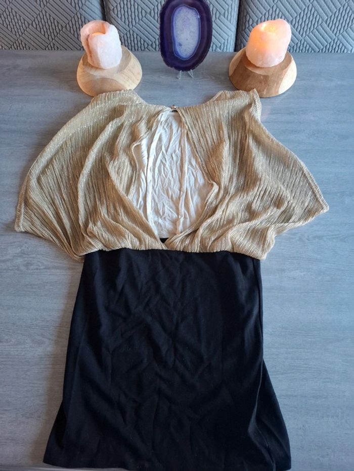 Jolie robe bicolore sans manche effet chauve souris Avec dos dégagé De couleur noire et dorée Taille 38-40 Très bon état Sans Marque spécifique Envoi rapide et soigné 📪 tous modes d'envois sauf Vintedgo 📪 Maison non-fumeur 🏠