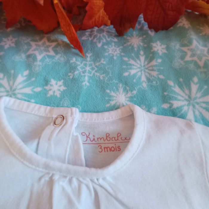 #sebelo02T3mois Beau t-shirt manche longue De couleur blanc Taille 3 mois Excellent état Marque kimbaloo 🌈 Pensez au lot afin de limiter les frais de port mais aussi pour faire des économies car les réductions sont actives dès 2 articles 😍 🌈 Plusieurs articles dans mon dressing de la même taille. Profitez en 🤩 ✉️ 📩 Envois rapide ✉️ 📩 ( max 2 jours, tout modes) 📦📬 Envoi très soigné 📬📦