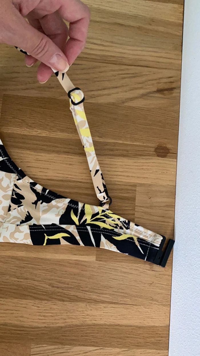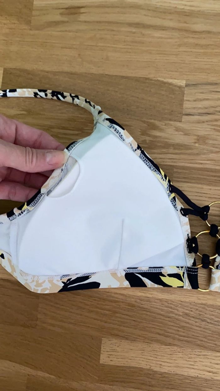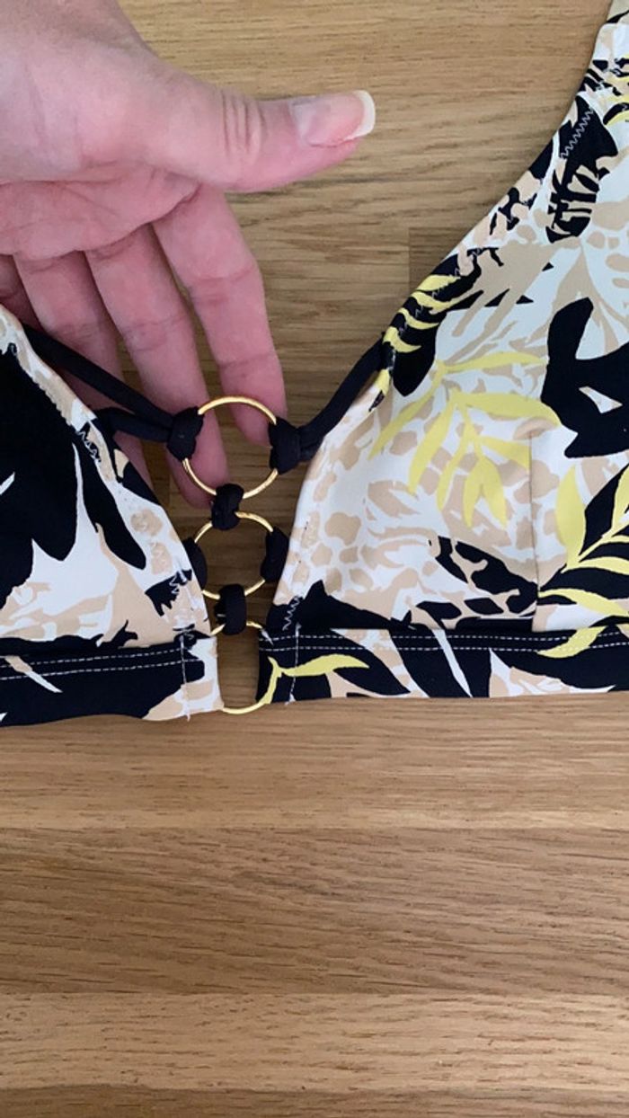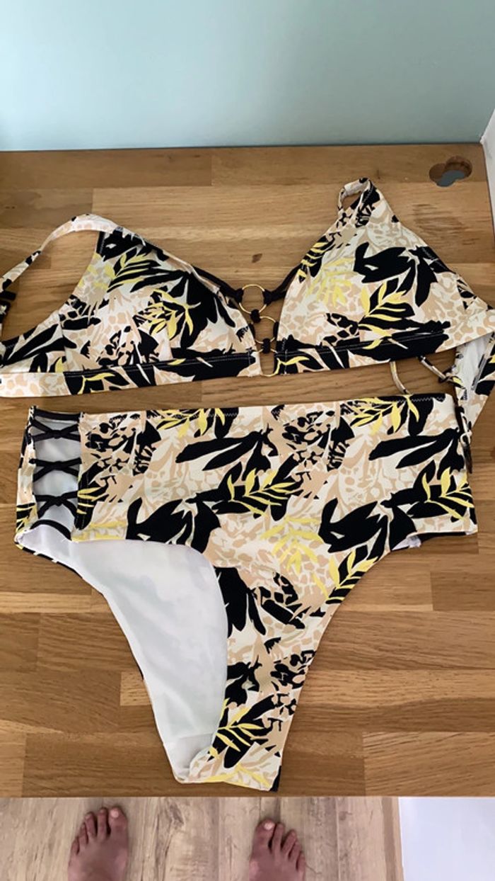 Maillot de bain 2 pièces Culotte taille haute avec effet lacet de chaque côté Haut de maillot avec effet lacet et anneaux dorés entre les seins Bretelles réglables Étiquettes coupées Jamais porté car cadeau qui ne convient pas