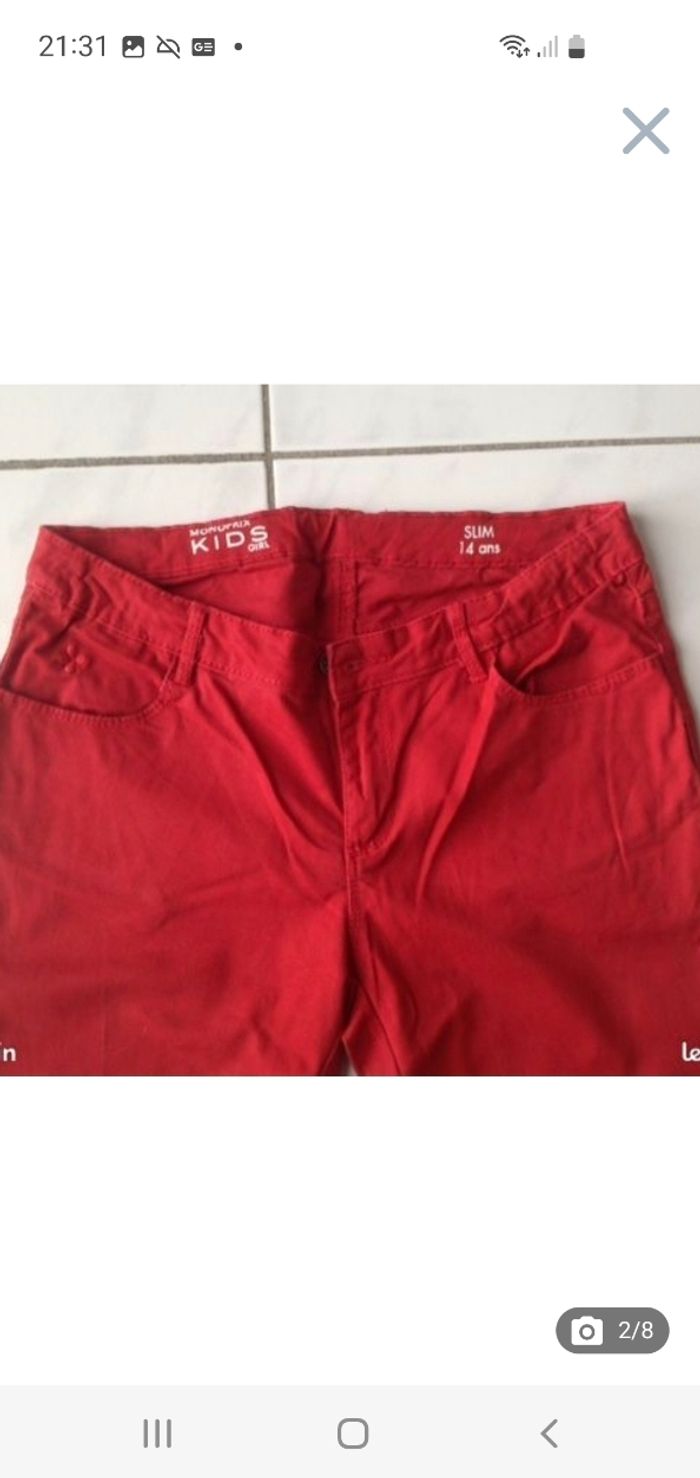 Pantalon fille coupe slim, de couleur rouge carmin, de taille 14 ans, de marque Monoprix Kids. Taille élastiquée permettant de régler le tour de taille. Passants pour ceinture. 2 poches à l'arrière, 2 poches devant. Fermeture par fermeture éclair + bouton. Composition : 98% coton, 2% élasthane. Très bon état.