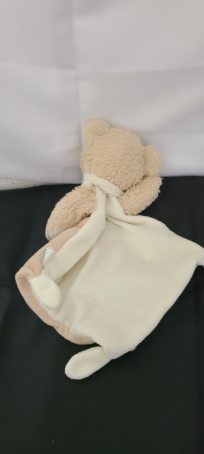 Doudou plat ours beige écharpe blanche losange 3 noeuds TEX Baby Carrefour CMI - photo numéro 3