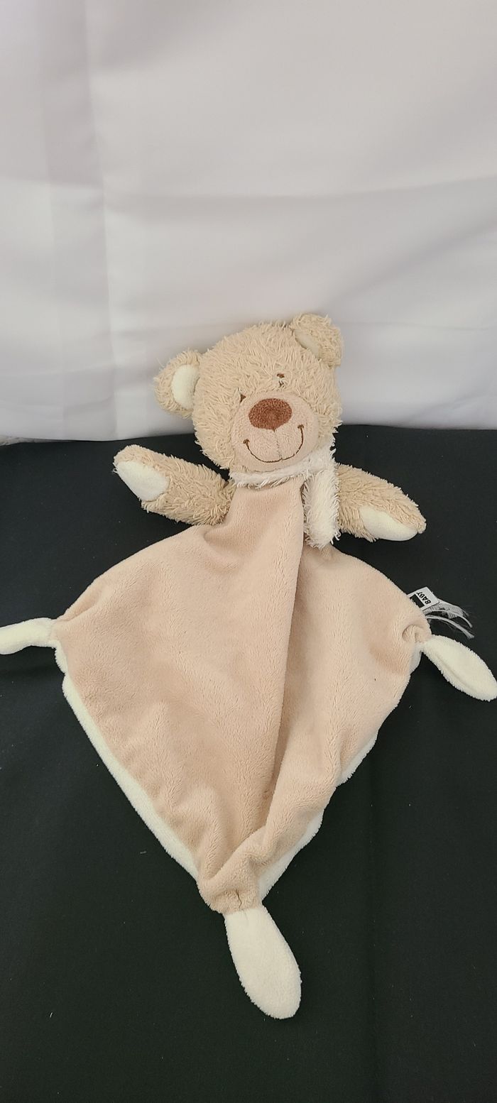 Doudou plat ours beige écharpe blanche losange 3 noeuds TEX Baby Carrefour CMI - photo numéro 1
