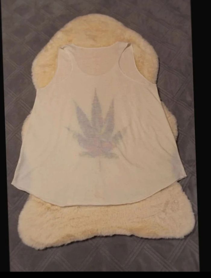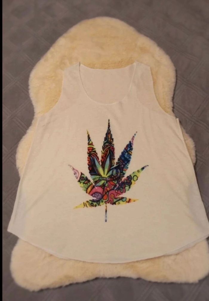Débardeur blanc avec belle feuille Porté 1 fois, très bon état Taille M Sans marque Envoi rapide et soigné N’hésitez pas si vous avez des questions