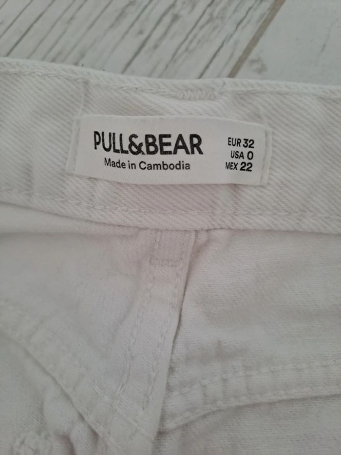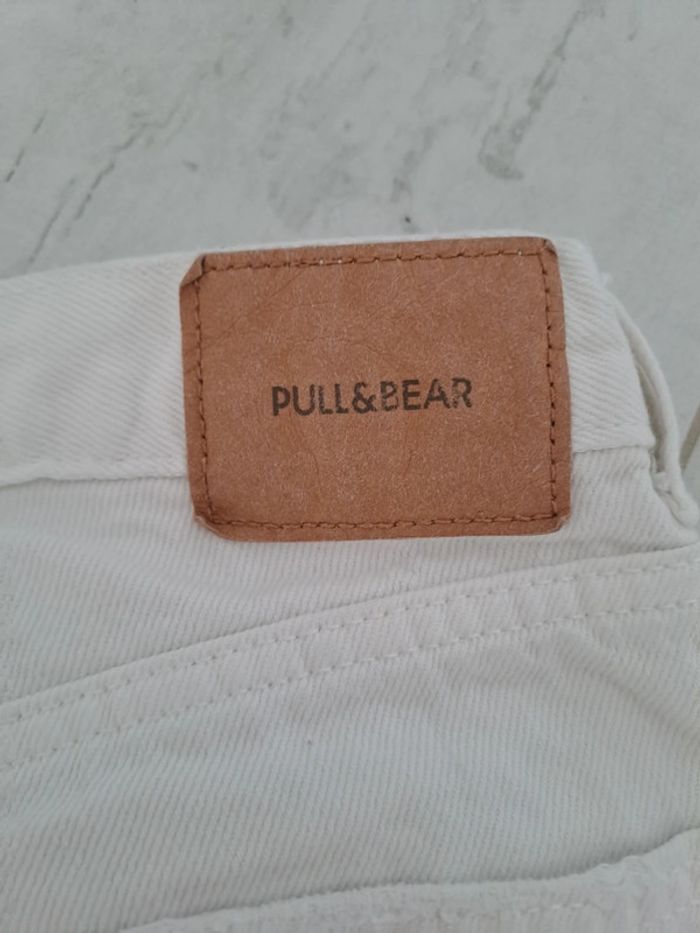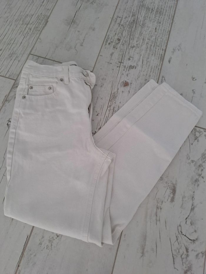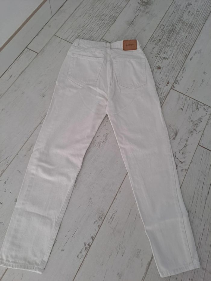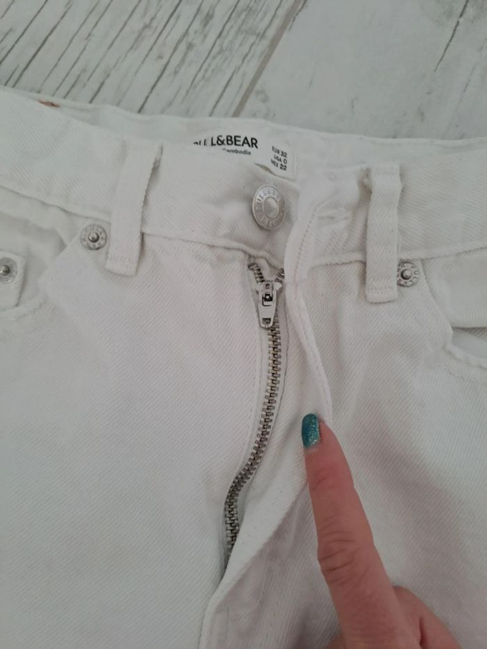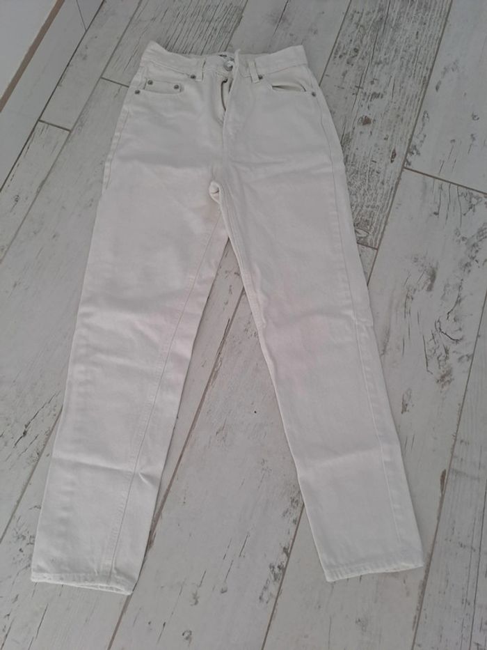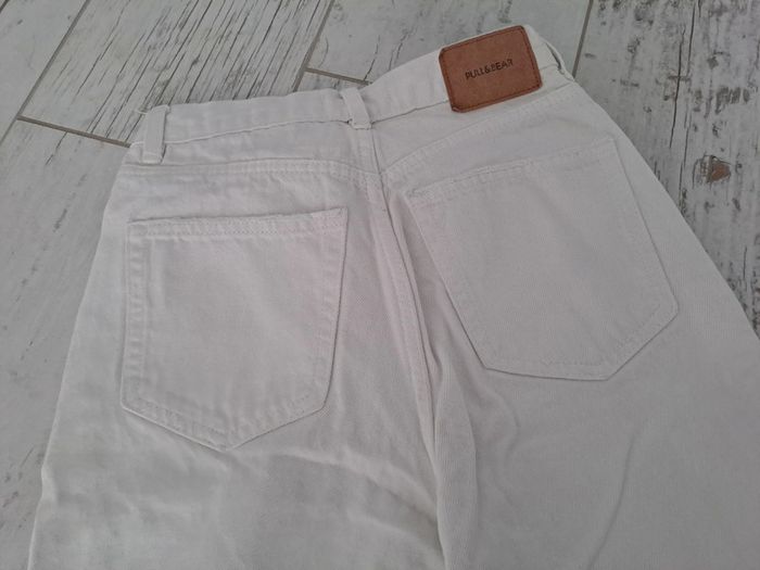Jean taille haute coupe Mom blanc comme neuf. Trop petit pour ma fille taille 32 de chez Pull and Bear. Très peu porté ma fille à fait une poussée de croissance. Vous le constaterez par l'étiquette marron à l'arrière en haut qui montre bien qu'il est comme neuf #mindie222tailleXXS