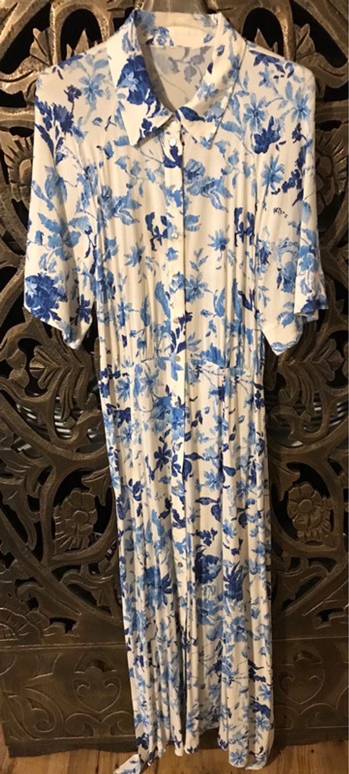 Robe longue très agréable à porter tissu fluide coupe évasée avec col et manches courtes taille 38/40 état NEUF