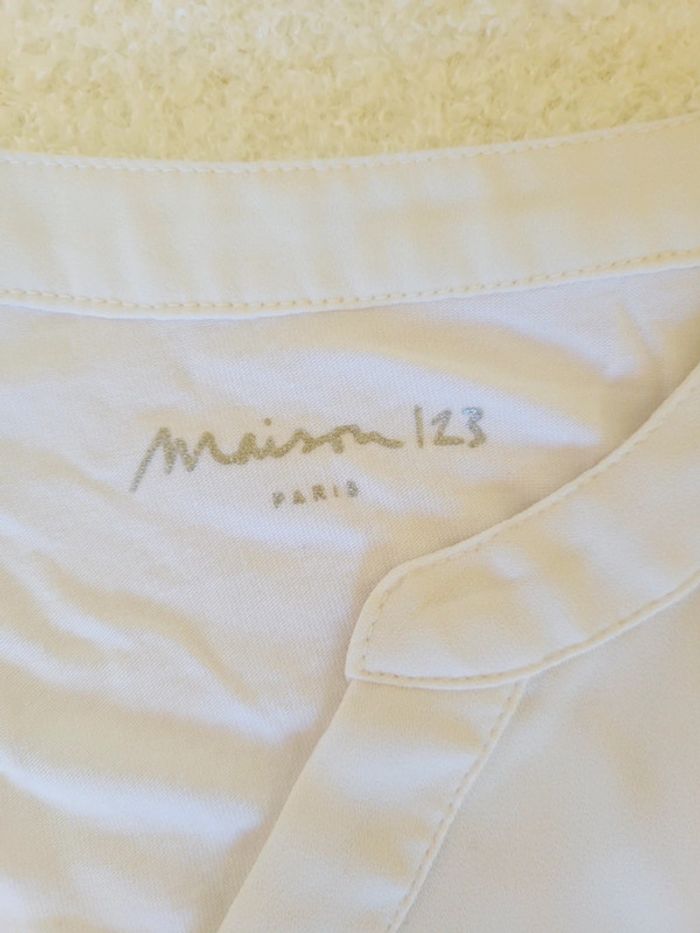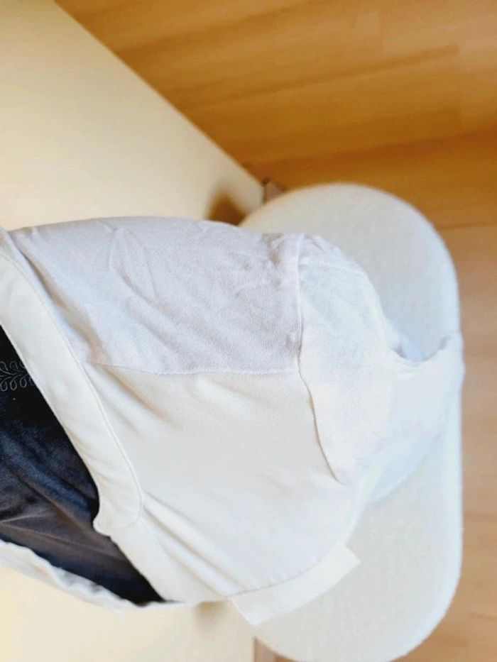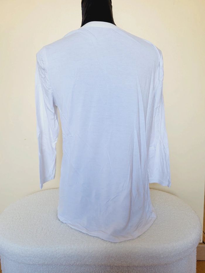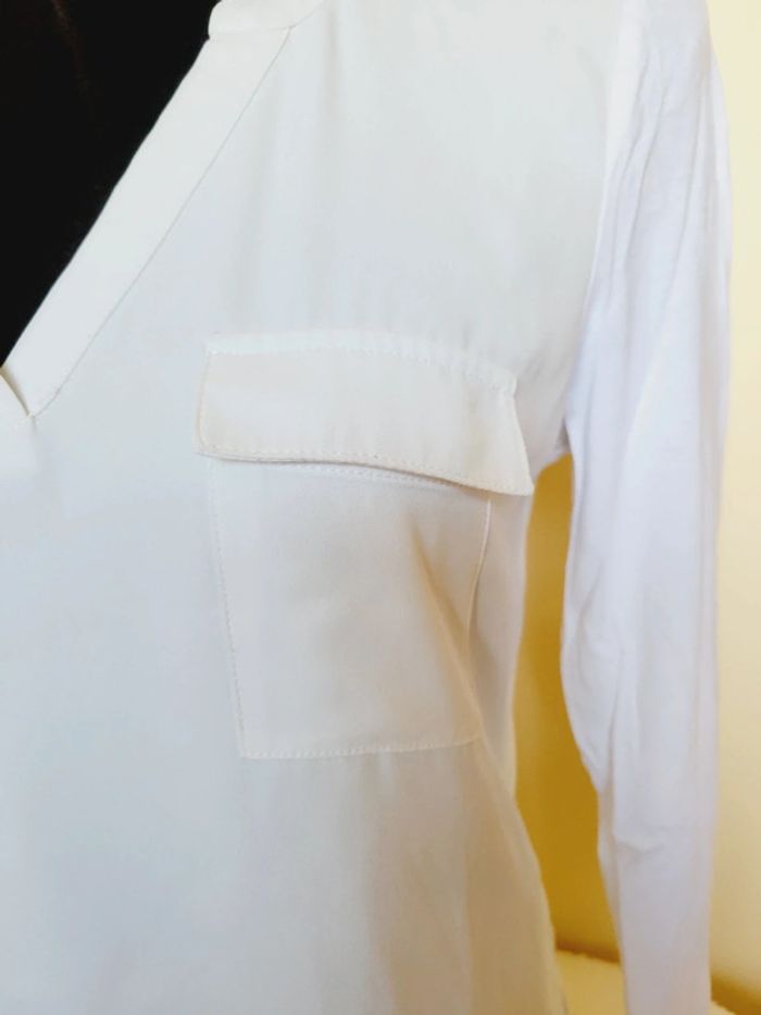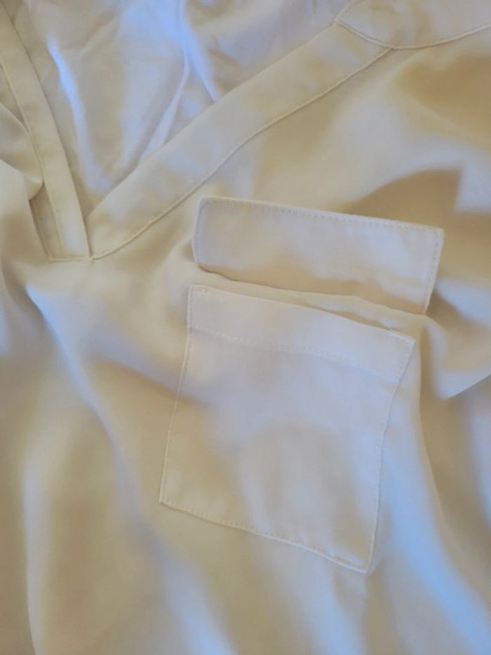 Blanc cassé devant en matière douce, blanc derrière en coton. Avec poche à l'avant. Manches 3/4 Taille 40 Défaut une petite tache devant Mesure : Longueur 61 cm, largeur aisselle : 45 cm #audreycouturier40 #l #maison132