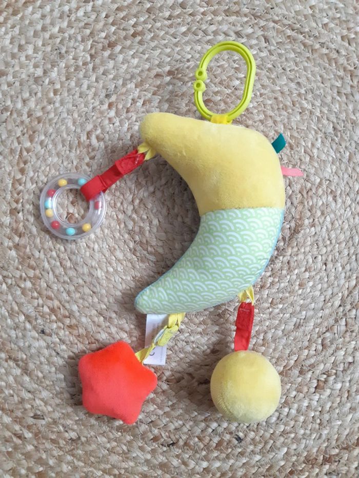 "Une boîte à musique toute douce en forme de lune pour inviter bébé au sommeil ! Une douce mélodie à découvrir lorsqu’on tire sur la lune. Une variété d’activités détachables pour éveiller les sens de bébé : - Balle avec grelot à l’intérieur - Etoile avec un « pouet » - Hochet à billes. Différentes matières textiles pour stimuler le toucher. Se fixe facilement à tous supports à l’aide de son crochet en plastique." #anthonyagnes_bebejouet