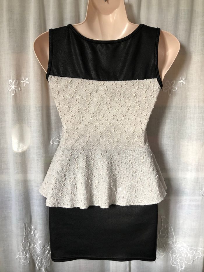 Robe sans manche bi matières aspect cuir noir et tissus beige boules et sequins Taille 12 ans 95% polyester 5% élasthanne fabriqué en France 🇫🇷